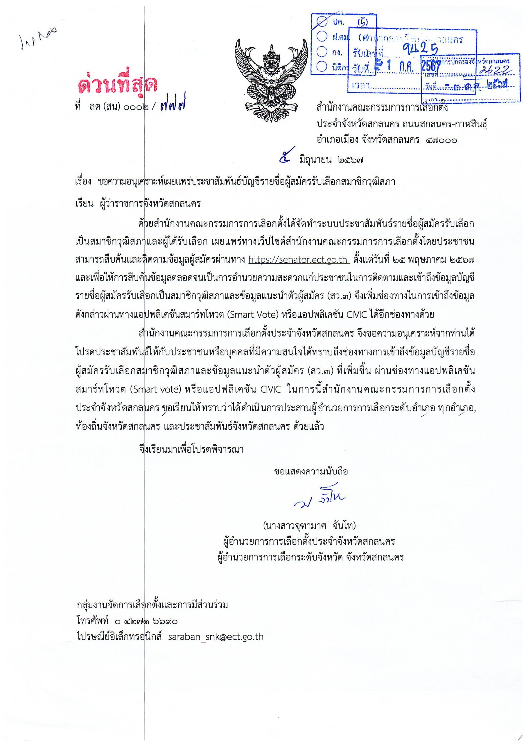 ด่วนที่สุด ที่ ลต (สน) 0002/777 ลงวันที่ 5 มิถุนายน 2567 เรื่อง ขอความอนุเคราะห์เผยแพร่ประชาสัมพันธ์บัญชีรายชื่อผู้สมัครรับเลือกสมาชิกวุฒิสภา DopaAdmin8 กรกฎาคม 24ข่าวประชาสัมพันธ์
