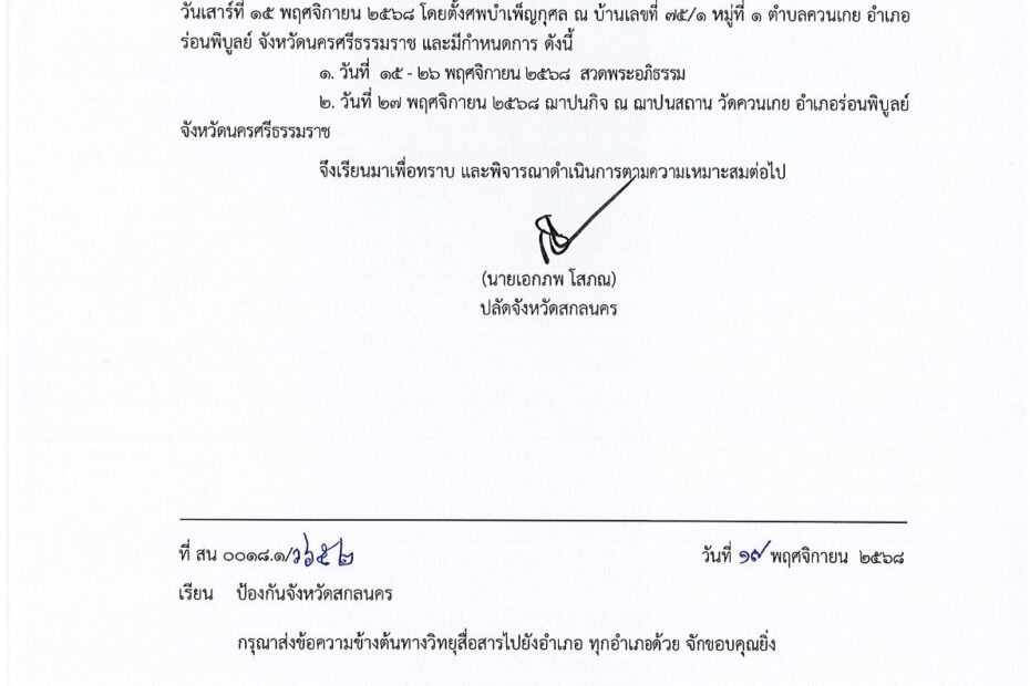 ด่วนที่สุด ที่ สน 0018.1/ว 652 ลงวันที่ 17 พฤศจิกายน 2568 เรียน นายอำเภอ ทุกอำเภอ เรื่อง กำหนดการสวดพระอภิธรรมและฌาปนกิจศพ DopaAdmin18 พฤศจิกายน 25กลุ่มงานปกครอง, ประกาศ/ระเบียบ/ดาวน์โหลด