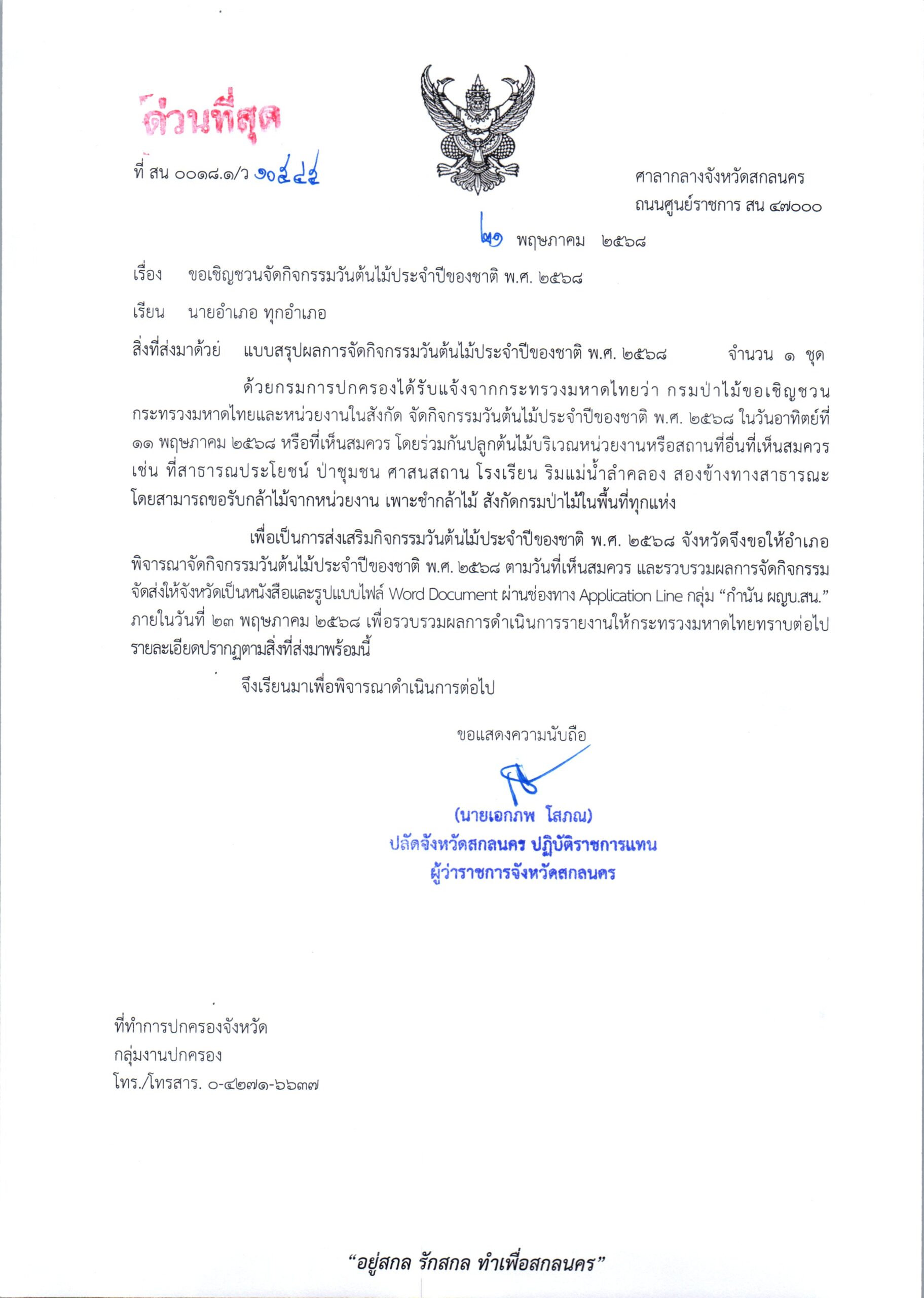 ด่วนที่สุด ที่ สน 0018.1/ว 9921 ลงวันที่ 13 พฤษภาคม 2568 เรียน นายอำเภอบ้านม่วง นายอำเภอเจริญศิลป์ นายอำเภอกุดบาก และนายอำเภอนิคมน้ำอูน เรื่อง การกำกับและติดตามผลการปฏิบัติราชการในหน้าที่ปลัดจังหวัด ประจำปีงบประมาณ พ.ศ. 2568 DopaAdmin13 พฤษภาคม 25กลุ่มงานปกครอง, ประกาศ/ระเบียบ/ดาวน์โหลด