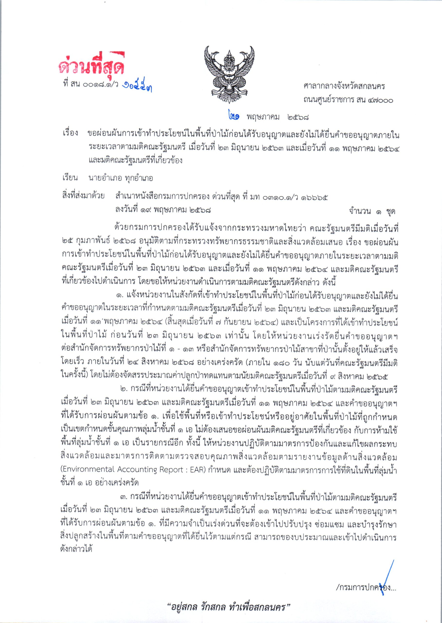 ด่วนที่สุด ที่ สน 0018.1/ว 10553 ลงวันที่ 21 พฤษภาคม 2568 เรียน นายอำเภอ ทุกอำเภอ เรื่อง ขอผ่อนผันการเข้าทำประโยชน์ในพื้นที่ป่าไม้ก่อนได้รับอนุญาตและยังไม่ได้ยื่นคำขออนุญาตภายใน ระยะเวลาตามมติคณะรัฐมนตรี เมื่อวันที่ 23 มิถุนายน 2563 และเมื่อวันที่ 11 พฤษภาคม 2564 และมติคณะรัฐมนตรีที่เกี่ยวข้อง DopaAdmin21 พฤษภาคม 25กลุ่มงานปกครอง, ข่าวประชาสัมพันธ์, ประกาศ/ระเบียบ/ดาวน์โหลด