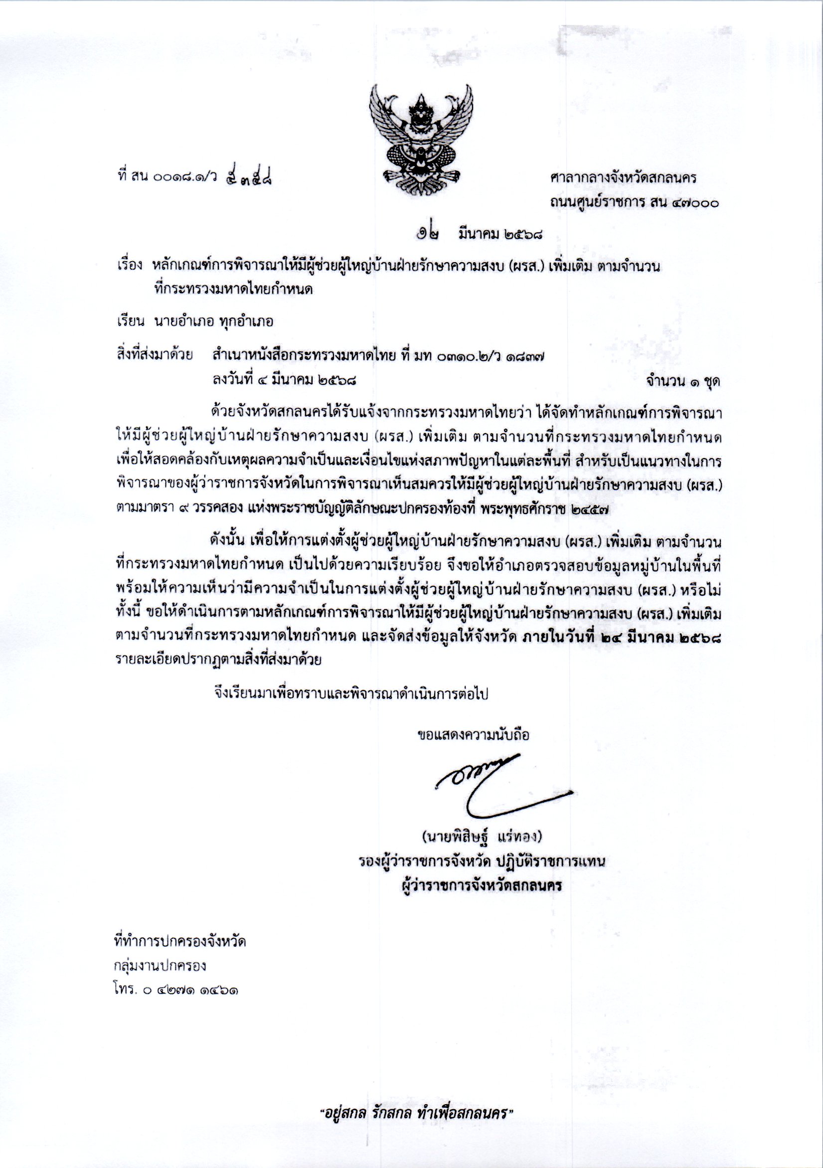 หนังสือจังหวัดสกลนคร ด่วนที่สุด ที่ สน 0018.1/ว 6758 ลงวันที่ 26 มีนาคม 2568 เรื่อง โครงการคัดเลือกหมู่บ้านเข้มแข็ง ตามแนวทาง “แผ่นดินธรรม แผ่นดินทอง” (หมู่บ้านอยู่เย็น) ประจำปี 2567 เรียน นายอำเภอ ทุกอำเภอ DopaAdmin26 มีนาคม 25กลุ่มงานปกครอง, ข่าวประชาสัมพันธ์, ประกาศ/ระเบียบ/ดาวน์โหลด