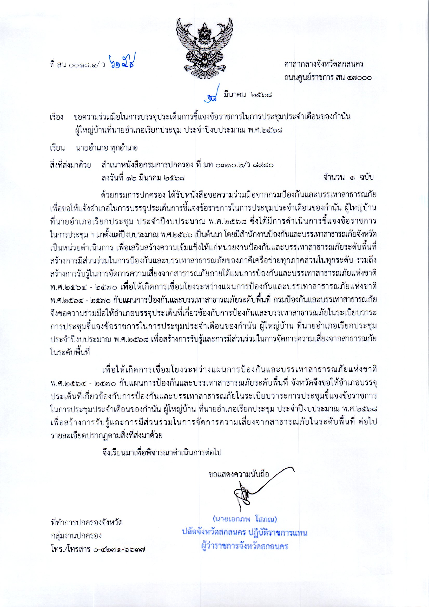 หนังสือจังหวัดสกลนคร ด่วนที่สุด ที่ สน 0018.1/ว 6662 ลงวันที่ 25 มี.ค. 68 เรื่อง การติดตามเพื่อเพิ่มประสิทธิภาพการปฏิบัติหน้าที่ของกำนัน ผู้ใหญ่บ้าน (Active Monitoring) ประจำปี 2568 เรียน นายอำเภอ ทุกอำเภอ DopaAdmin25 มีนาคม 25กลุ่มงานปกครอง, ข่าวประชาสัมพันธ์, ประกาศ/ระเบียบ/ดาวน์โหลด
