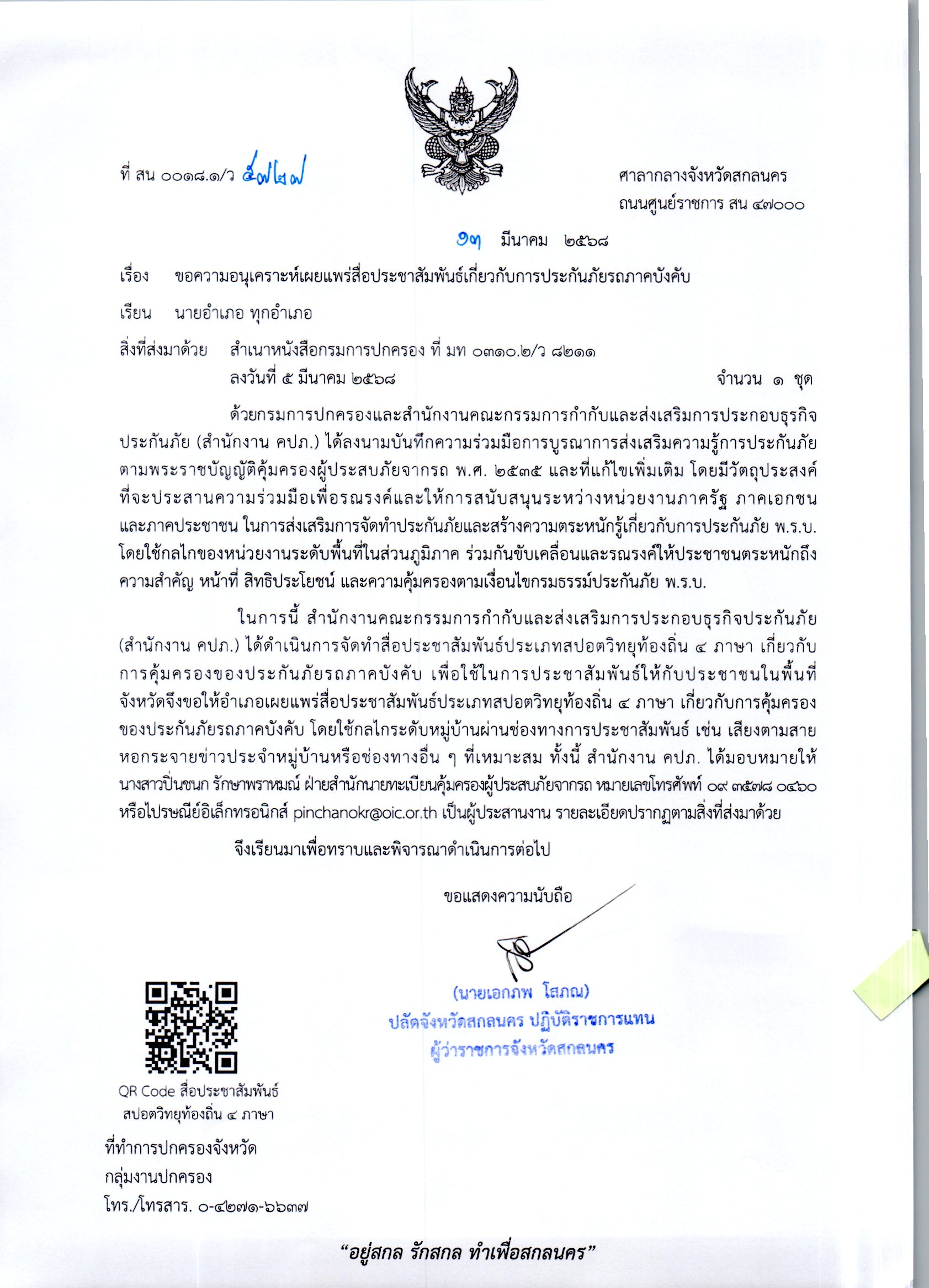 ที่ สน 0018.1/ว 5727 ลงวันที่ 13 มีนาคม 2568 เรียน นายอำเภอ ทุกอำเภอ เรื่อง ขอความอนุเคราะห์เผยแพร่สื่อประชาสัมพันธ์เกี่ยวกับการประกันภัยรถภาคบังคับ DopaAdmin14 มีนาคม 25กลุ่มงานปกครอง, ประกาศ/ระเบียบ/ดาวน์โหลด