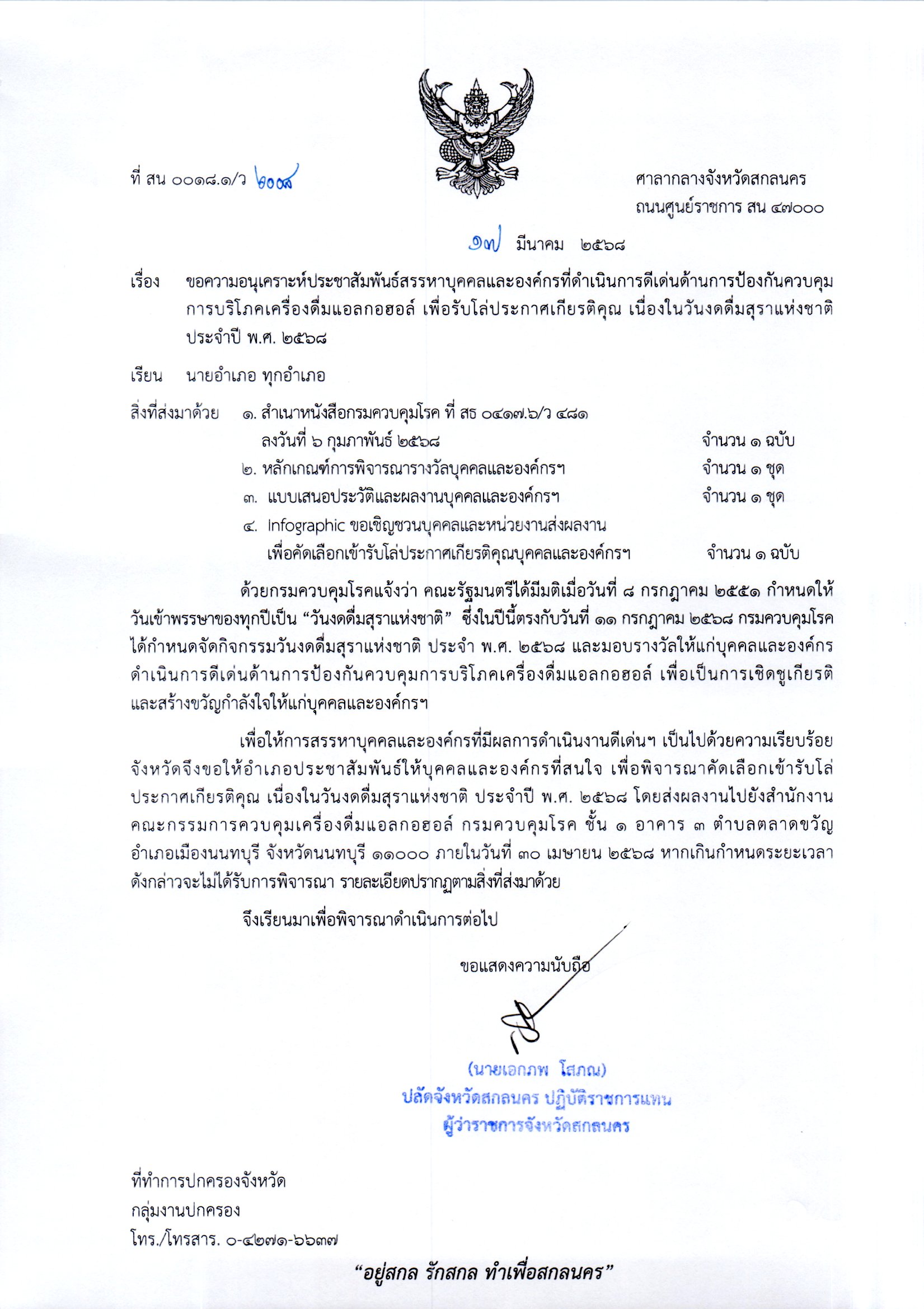 ที่ สน 0018.1/ว 6008 ลงวันที่ 17 มีนาคม 2568 เรียน นายอำเภอ ทุกอำเภอ เรื่อง ขอความอนุเคราะห์ประชาสัมพันธ์สรรหาบุคคลและองค์กรที่ดำเนินการดีเด่นด้านการป้องกันควบคุมการบริโภคเครื่องดื่มแอลกอฮอล์ เพื่อรับโล่ประกาศเกียรติคุณ เนื่องในวันงดดื่มสุราแห่งชาติประจำปี พ.ศ. 2568 DopaAdmin17 มีนาคม 25กลุ่มงานปกครอง, ข่าวประชาสัมพันธ์, ประกาศ/ระเบียบ/ดาวน์โหลด