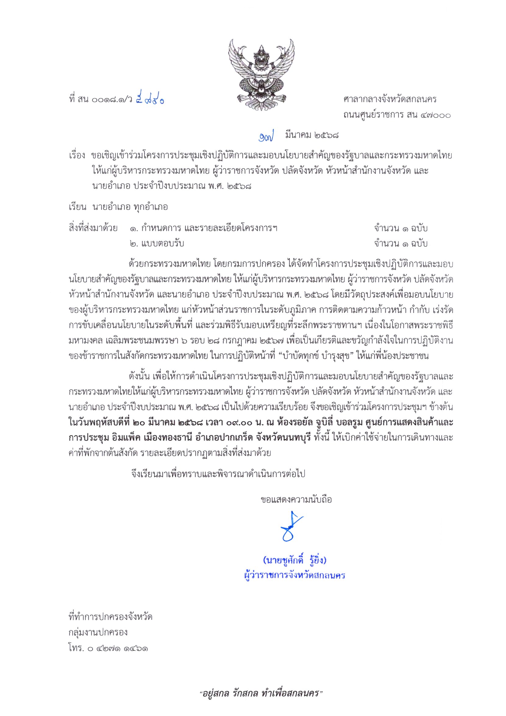 หนังสือจังหวัดสกลนคร ที่ สน 0018.1/ว 5714 ลงวันที่ 13 มีนาคม 2568 เรื่อง กำหนดการออกตรวจประเมินผลงานและตัดสิน ตามโครงการคัดเลือกหมู่บ้านเข้มแข็งตามแนวทาง “แผ่นดินธรรม แผ่นดินทอง” (หมู่บ้านอยู่เย็น) ประจำปี 2568 ระดับจังหวัด เรียน นายอำเภอโคกศรีสุพรรณ และนายอำเภอส่องดาว DopaAdmin13 มีนาคม 25กลุ่มงานปกครอง, ข่าวประชาสัมพันธ์, ประกาศ/ระเบียบ/ดาวน์โหลด