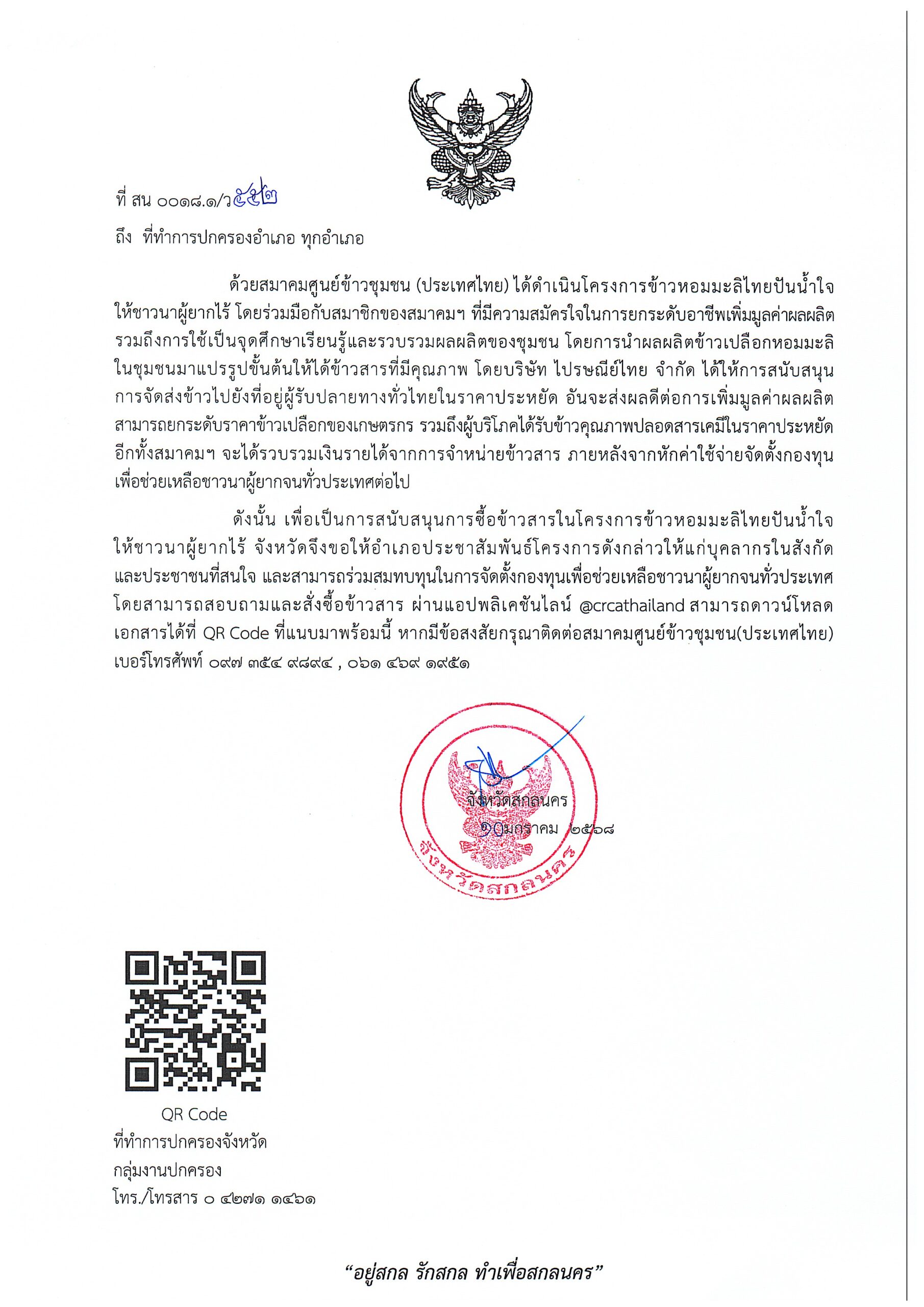 หนังสือจังหวัด ที่ สน 0018.1/ว552 ลงวันที่ 10 มกราคม 2568 เรื่อง ขอความอนุเคราะห์สนับสนุนโครงการข้าวหอมมะลิไทยปันน้ำใจให้ชาวนาผู้ยากไร้ เรียน นายอำเภอ ทุกอำเภอ DopaAdmin10 มกราคม 25กลุ่มงานปกครอง, ข่าวประชาสัมพันธ์, ประกาศ/ระเบียบ/ดาวน์โหลด