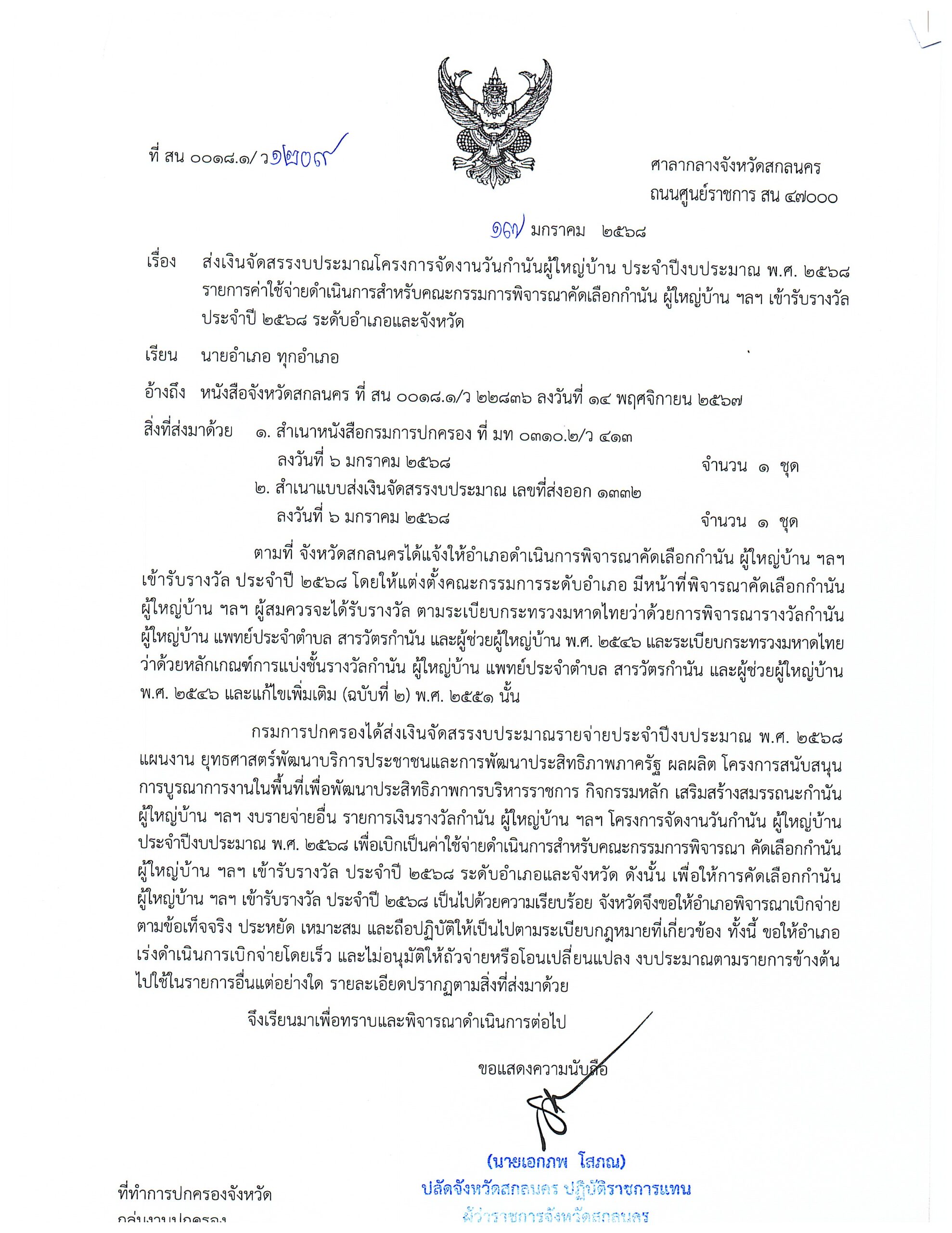 หนังสือจังหวัด ที่ สน 0018.1/ว 1209 ลงวันที่ 17 มกราคม 2568 เรื่อง ส่งเงินจัดสรรงบประมาณโครงการจัดงานวันกำนันผู้ใหญ่บ้าน ประจำปีงบประมาณ พ.ศ. 2568 รายการค่าใช้จ่ายดำเนินการสำหรับคณะกรรมการพิจารณาคัดเลือกกำนัน ผู้ใหญ่บ้าน ฯลฯ เข้ารับรางวัล ประจำปี 2568 ระดับอำเภอและจังหวัด เรียน นายอำเภอ ทุกอำเภอ DopaAdmin17 มกราคม 25กลุ่มงานปกครอง, ข่าวประชาสัมพันธ์, ประกาศ/ระเบียบ/ดาวน์โหลด