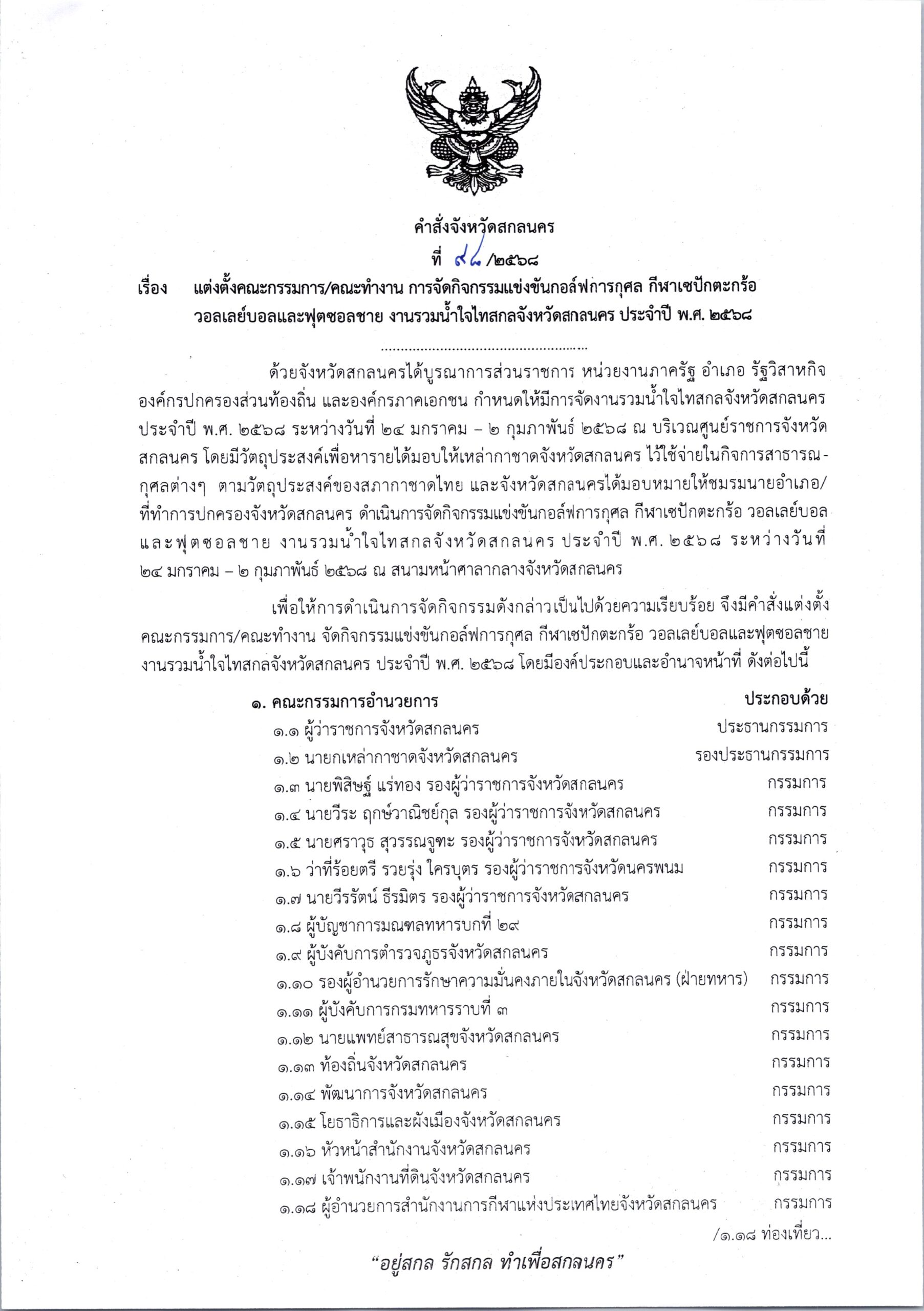 ที่ สน 0018.1/ว488 ลงวันที่ 9 มกราคม 2568 เรื่อง แต่งตั้งคณะกรรมการคณะทำงาน การจัดกิจกรรมแข่งขันกอล์ฟการกุศล กีฬาเซปักตะกร้อ วอลเลย์บอลและฟุตซอลชาย งานรวมน้ำใจไทสกลจังหวัดสกลนคร ประจำปี พ.ศ. 2568 DopaAdmin9 มกราคม 25กลุ่มงานปกครอง, ข่าวประชาสัมพันธ์, ประกาศ/ระเบียบ/ดาวน์โหลด