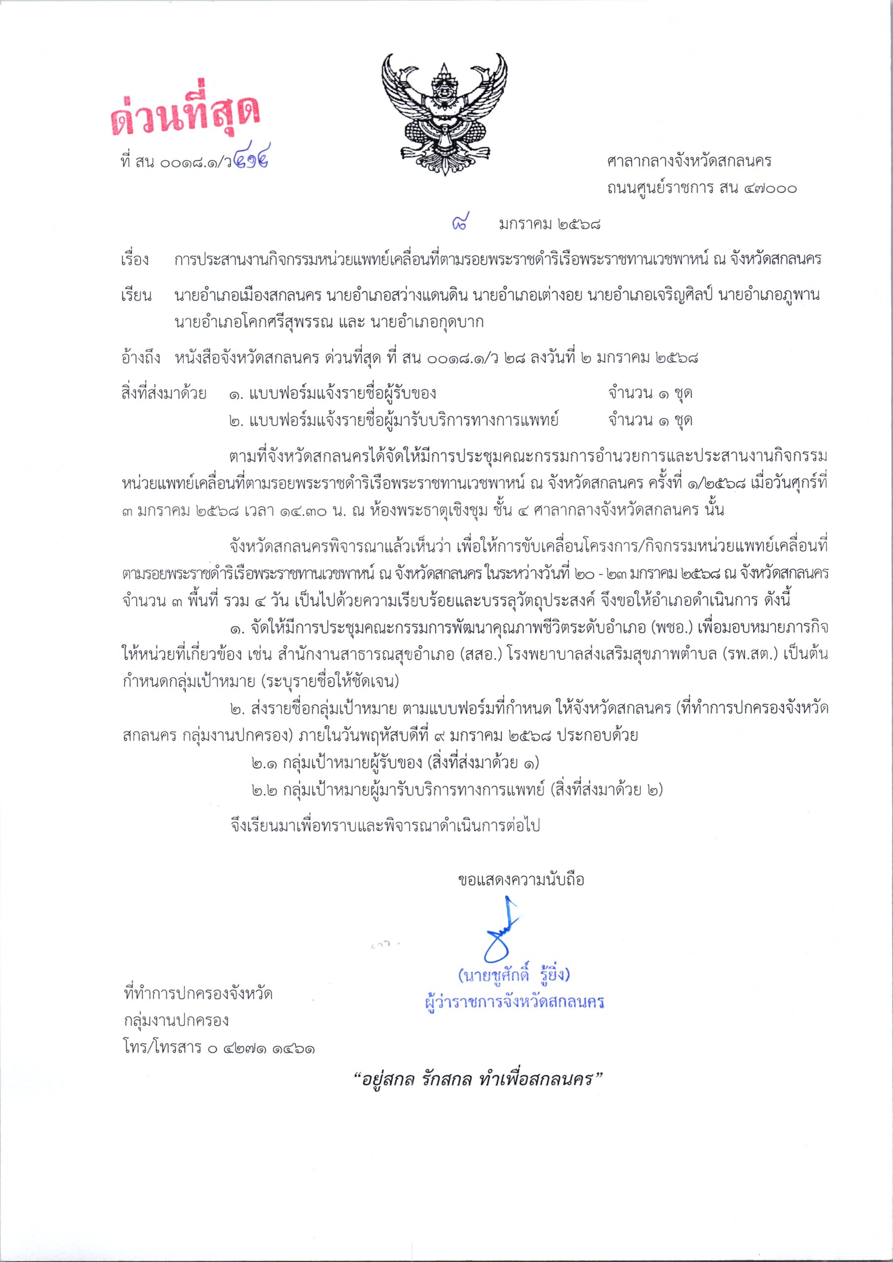 หนังสือจังหวัด ด่วนที่สุด ที่ สน 0018.1/ว414 ลงวันที่ 8 มกราคม 2568 เรื่อง การประสานงานกิจกรรมหน่วยแพทย์เคลื่อนที่ตามรอยพระราชดำริเรือพระราชทานเวชพาห์น ณ จังหวัดสกลนคร เรียน นายอำเภอเมืองสกลนคร นายอำเภอสว่างแดนดิน นายอำเภอเต่างอย นายอำเภอเจริญศิลป์ นายอำเภอภูพาน นายอำเภอโคกศรีสุพรรณ และ นายอำเภอกุดบาก DopaAdmin8 มกราคม 25กลุ่มงานปกครอง, ข่าวประชาสัมพันธ์, ประกาศ/ระเบียบ/ดาวน์โหลด