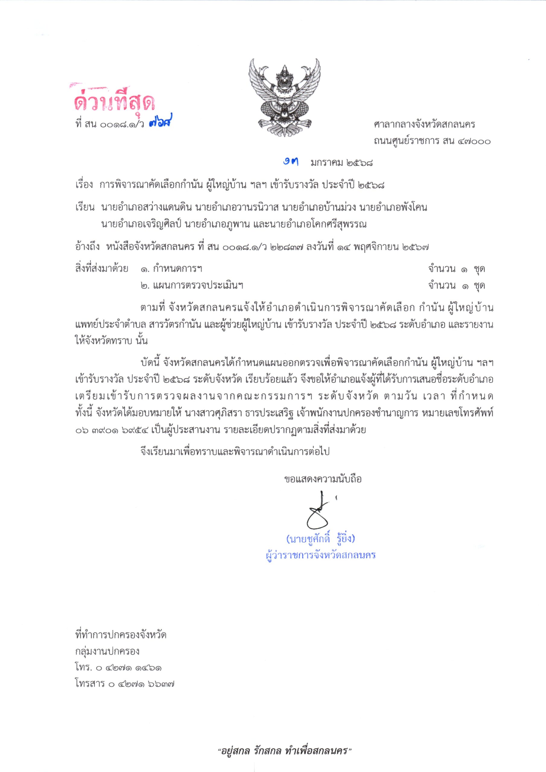 ด่วนที่สุด ที่ สน 0018.1/ว 768 ลงวันที่ 13 มกราคม 2568 เรียน นายอำเภอสว่างแดนดิน นายอำเภอวานรนิวาส นายอำเภอบ้านม่วง นายอำเภอพังโคน นายอำเภอเจริญศิลป์ นายอำเภอภูพาน และนายอำเภอโคกศรีสุพรรณ เรื่อง การพิจารณาคัดเลือกกำนัน ผู้ใหญ่บ้าน ฯลฯ เข้ารับรางวัล ประจำปี 2568 DopaAdmin14 มกราคม 25กลุ่มงานปกครอง, ประกาศ/ระเบียบ/ดาวน์โหลด