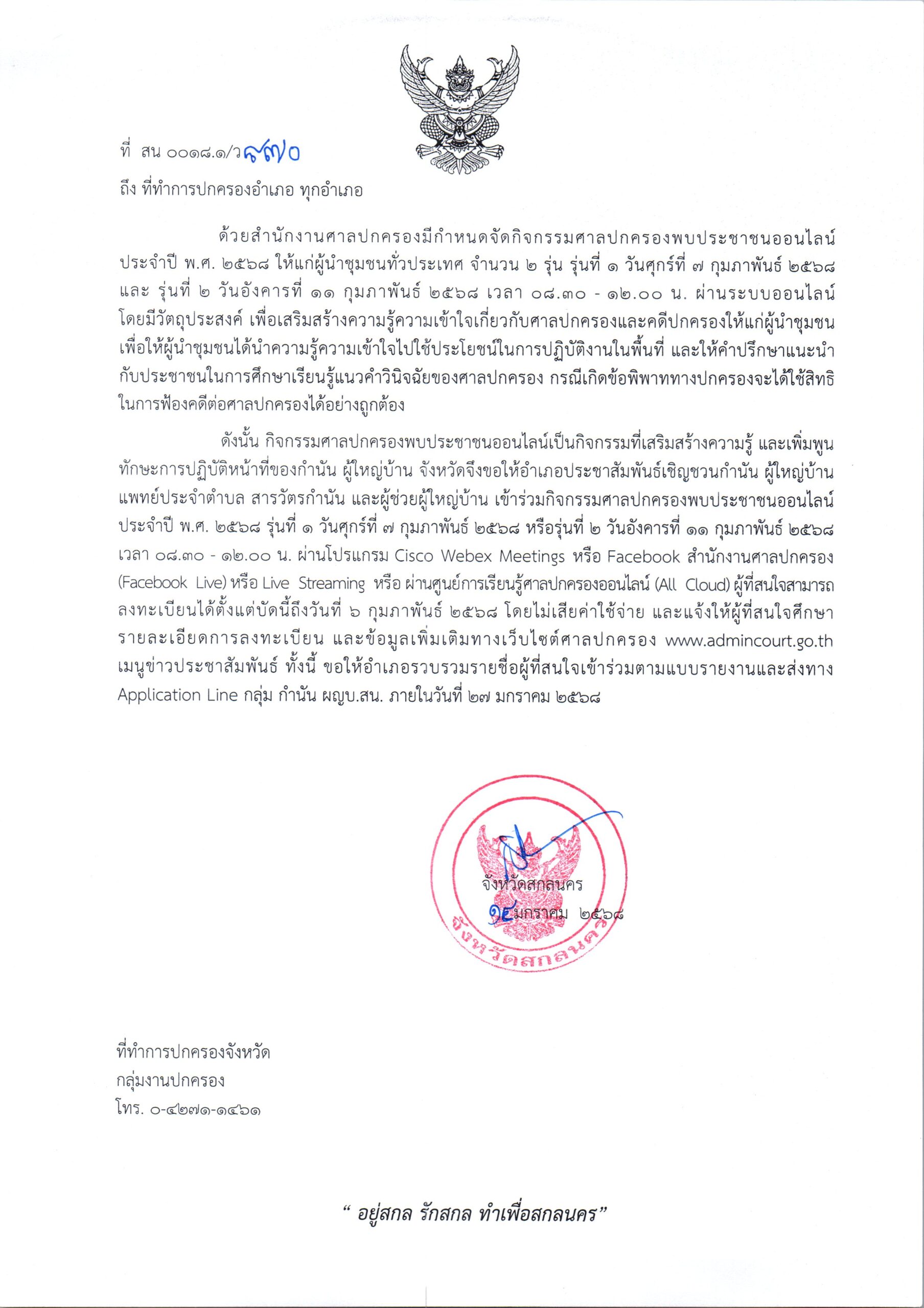 หนังสือจังหวัด ที่ สน 0018.1/ว870 ลงวันที่ 14 มกราคม 2568 เรื่อง ประชาสัมพันธ์กิจกรรมศาลปกครองพบประชาชนออนไลน์ ประจำปี พ.ศ. 2568 เรียน นายอำเภอ ทุกอำเภอ DopaAdmin14 มกราคม 25กลุ่มงานปกครอง, ข่าวประชาสัมพันธ์, ประกาศ/ระเบียบ/ดาวน์โหลด