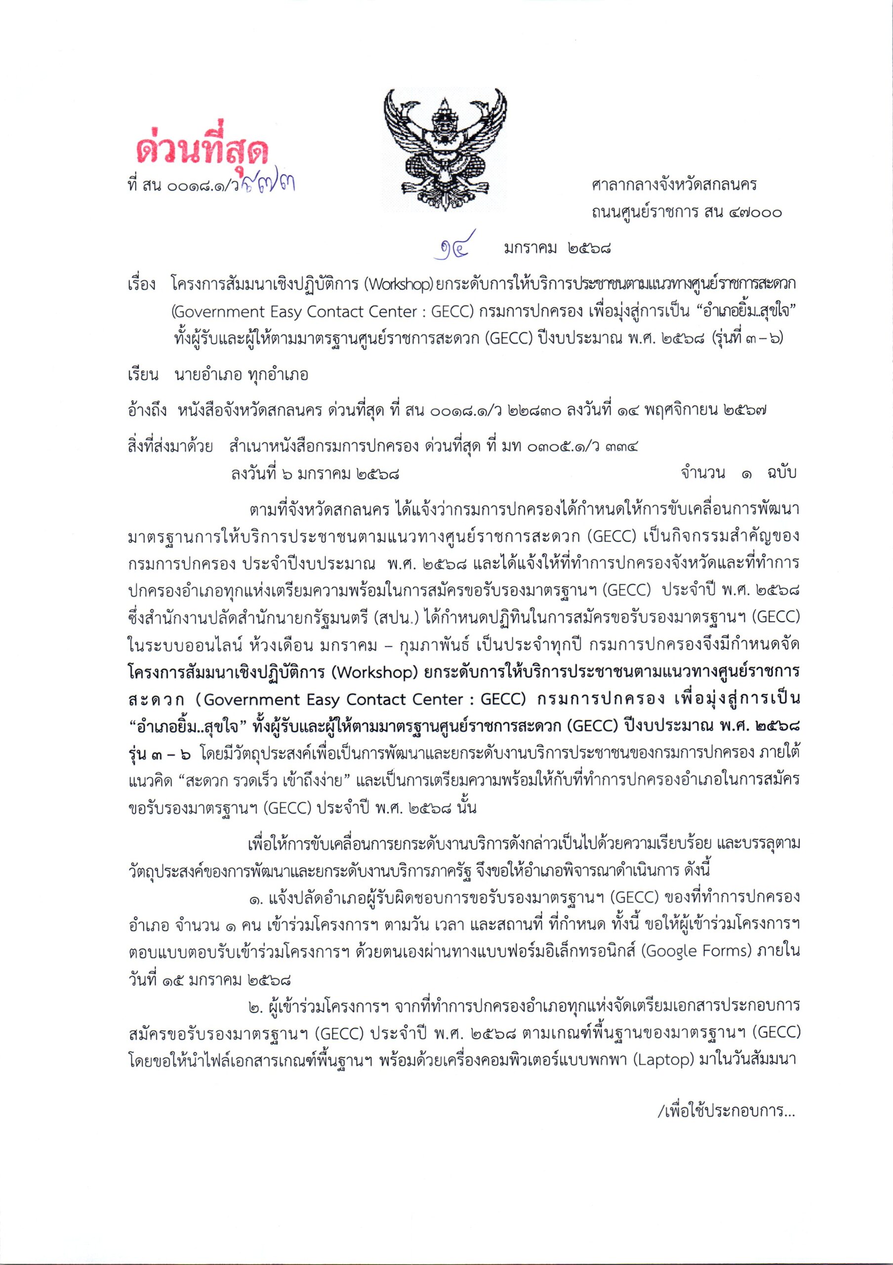 หนังสือจังหวัด ด่วนที่สุด ที่ สน 0018.1/ว 873 ลงวันที่ 14 มกราคม 2568 เรื่อง โครงการสัมมนาเชิงปฏิบัติการ (Workshop)ยกระดับการให้บริการประชาชนตามแนวทางศูนย์ราชการสะดวก (Government East Contact Center : GECC) กรมการปกครอง เพื่อมุ่งสู่การเป็น “อำเภอยิ้ม…สุขใจ”ทั้งผู้รับและผู้ให้ตามมาตรฐานศูนย์ราชการ (GECC) ) ปีงบประมาณ พ.ศ. 2568 (รุ่นที่ 3-6) เรียน นายอำเภอ ทุกอำเภอ DopaAdmin14 มกราคม 25กลุ่มงานปกครอง, ข่าวประชาสัมพันธ์, ประกาศ/ระเบียบ/ดาวน์โหลด