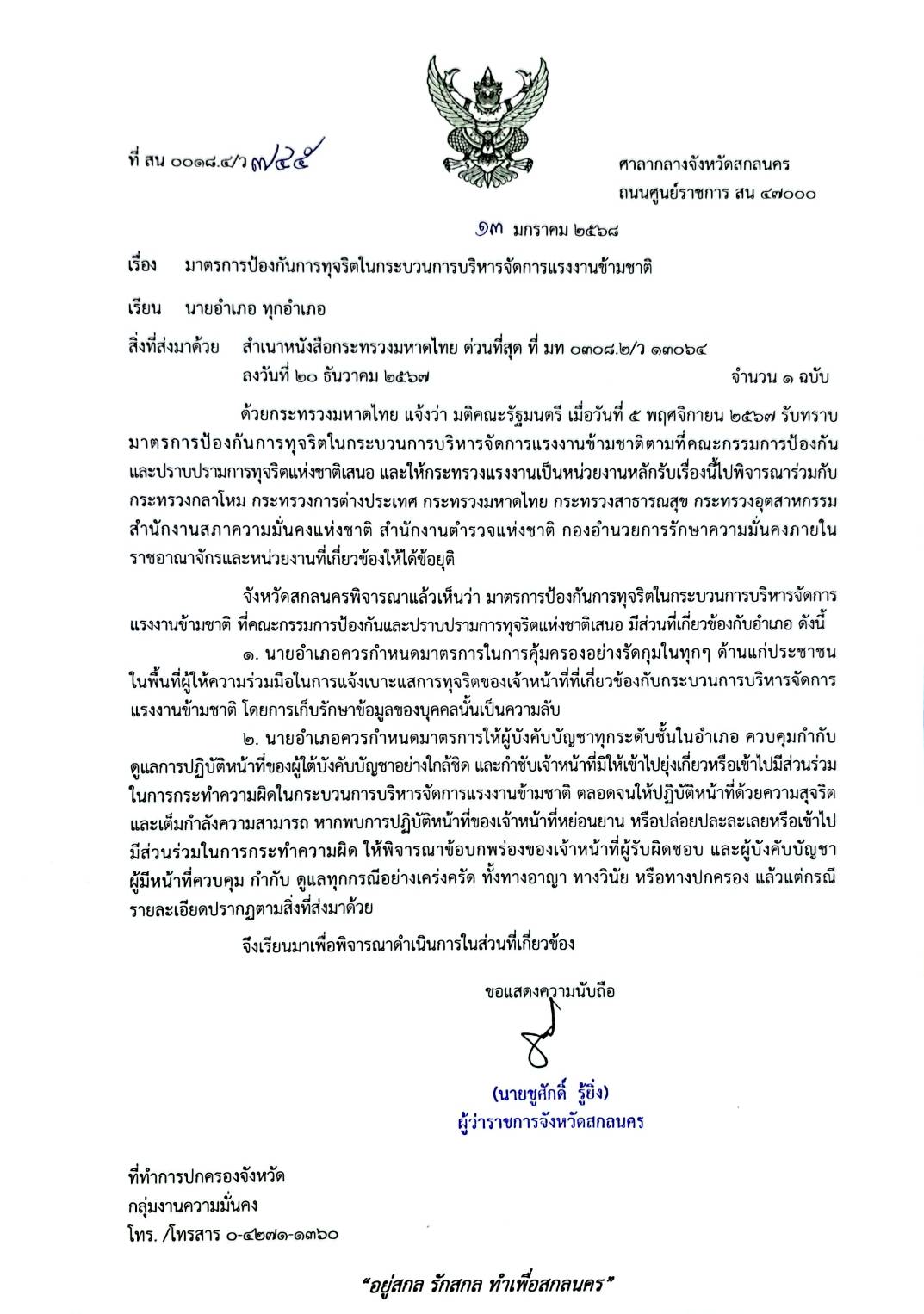 ที่ สน 0018.4/ว745 ลงวันที่ 13 มกราคม 2568 เรียน นายอำเภอ ทุกอำเภอ เรื่อง มาตรการป้องกันการทุจริตในกระบวนการบริหารจัดการแรงงานข้ามชาติ DopaAdmin14 มกราคม 25กลุ่มงานปกครอง, ประกาศ/ระเบียบ/ดาวน์โหลด