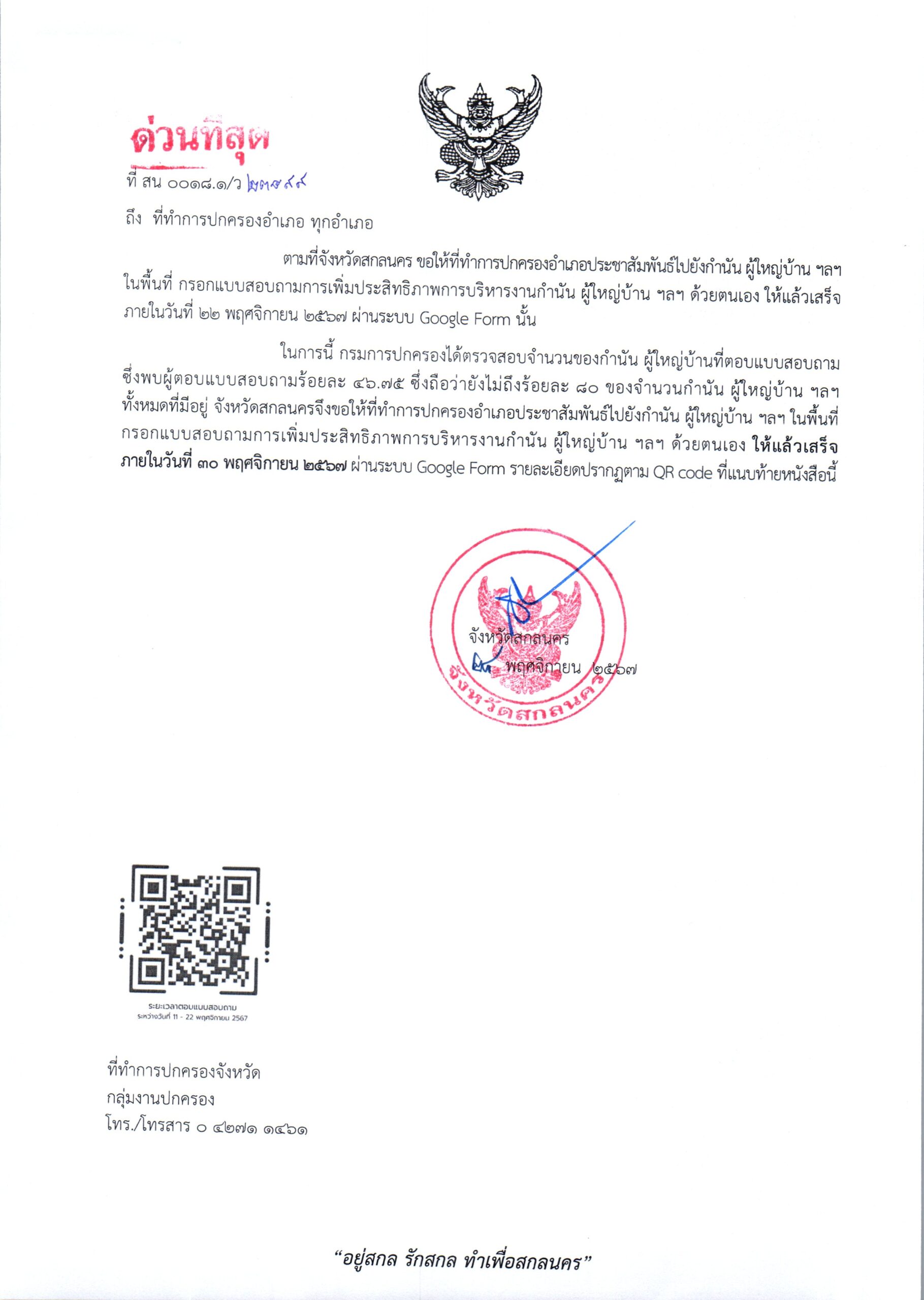 ที่ สน0018.1/ว23899 วันที่ 27 พฤศจิกายน 2567 เรียน ปลัดจังหวัดสกลนคร เรื่อง ขอประชาสัมพันธ์กรอกแบบสอบถามการเพิ่มประสิทธิภาพการบริหารงานกำนัน ผู้ใหญ่บ้าน ฯลฯ DopaAdmin28 พฤศจิกายน 24กลุ่มงานปกครอง, ประกาศ/ระเบียบ/ดาวน์โหลด