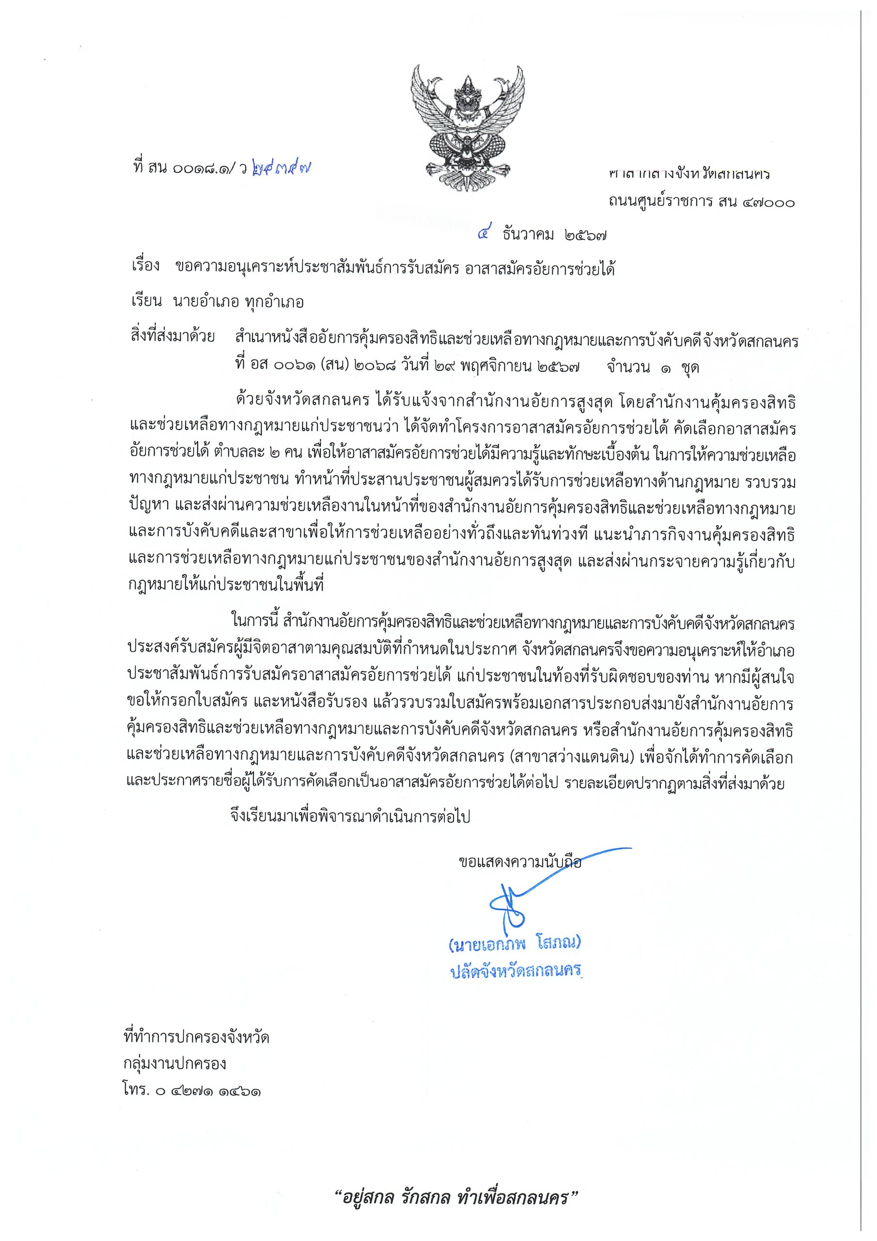 หนังสือจังหวัดสกลนคร ที่ สน 0018.1/ว 24347 ลงวันที่ 4 ธันวาคม 2567 เรื่อง ขอความอนุเคราะห์ประชาสัมพันธ์การรับสมัคร อาสาสมัครอัยการช่วยได้ เรียน นายอำเภอ ทุกอำเภอ DopaAdmin6 ธันวาคม 24กลุ่มงานปกครอง, ประกาศ/ระเบียบ/ดาวน์โหลด