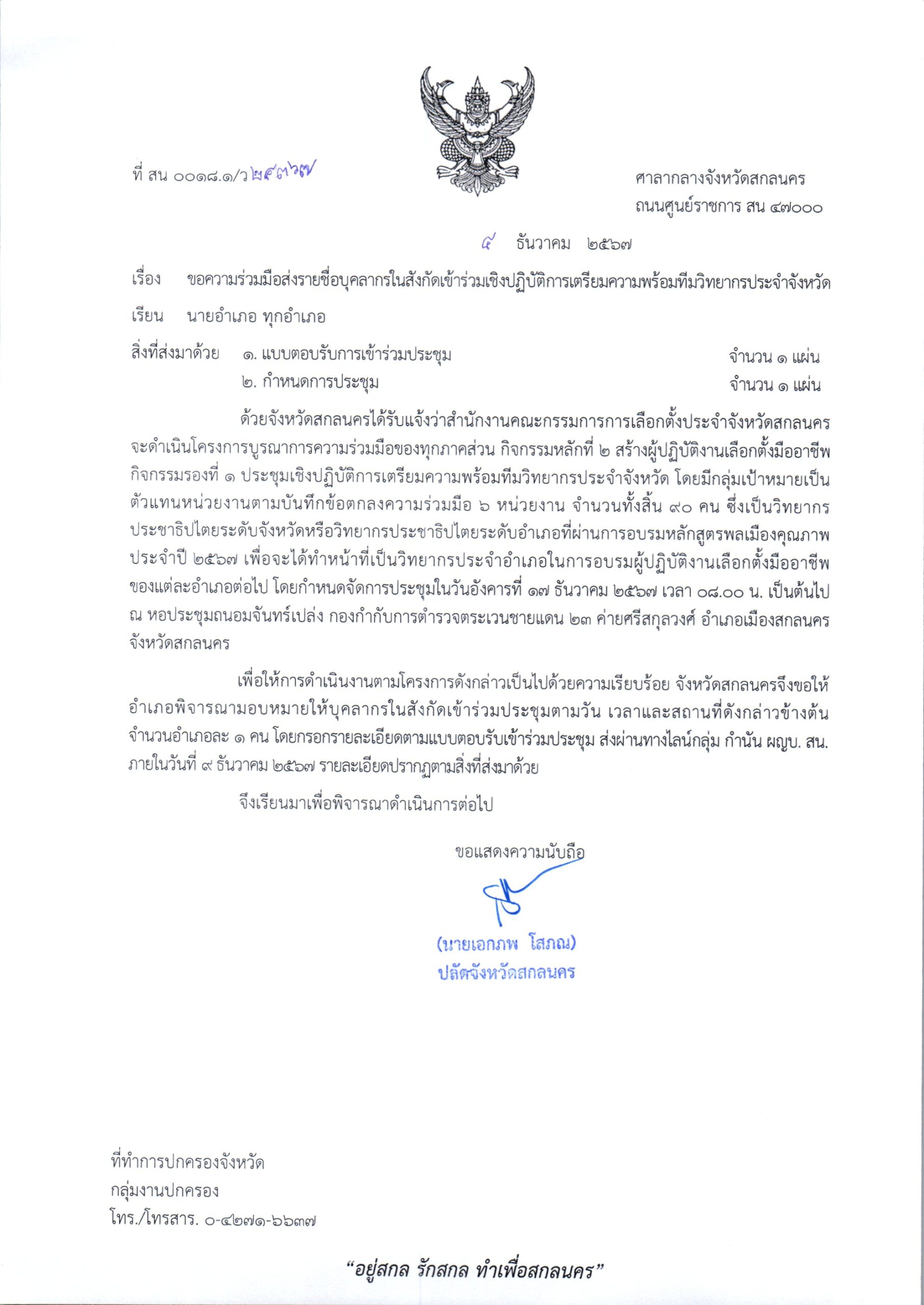 หนังสือจังหวัดสกลนคร ที่ สน 0018.1/23966 ลงวันที่ 29 พฤศจิกายน 2567 เรื่อง การแบ่งเขตเลือกตั้งองค์การบริหารส่วนจังหวัดสกลนคร เรียน นายอำเภอ ทุกอำเภอ DopaAdmin29 พฤศจิกายน 24กลุ่มงานปกครอง, ข่าวประชาสัมพันธ์, ประกาศ/ระเบียบ/ดาวน์โหลด