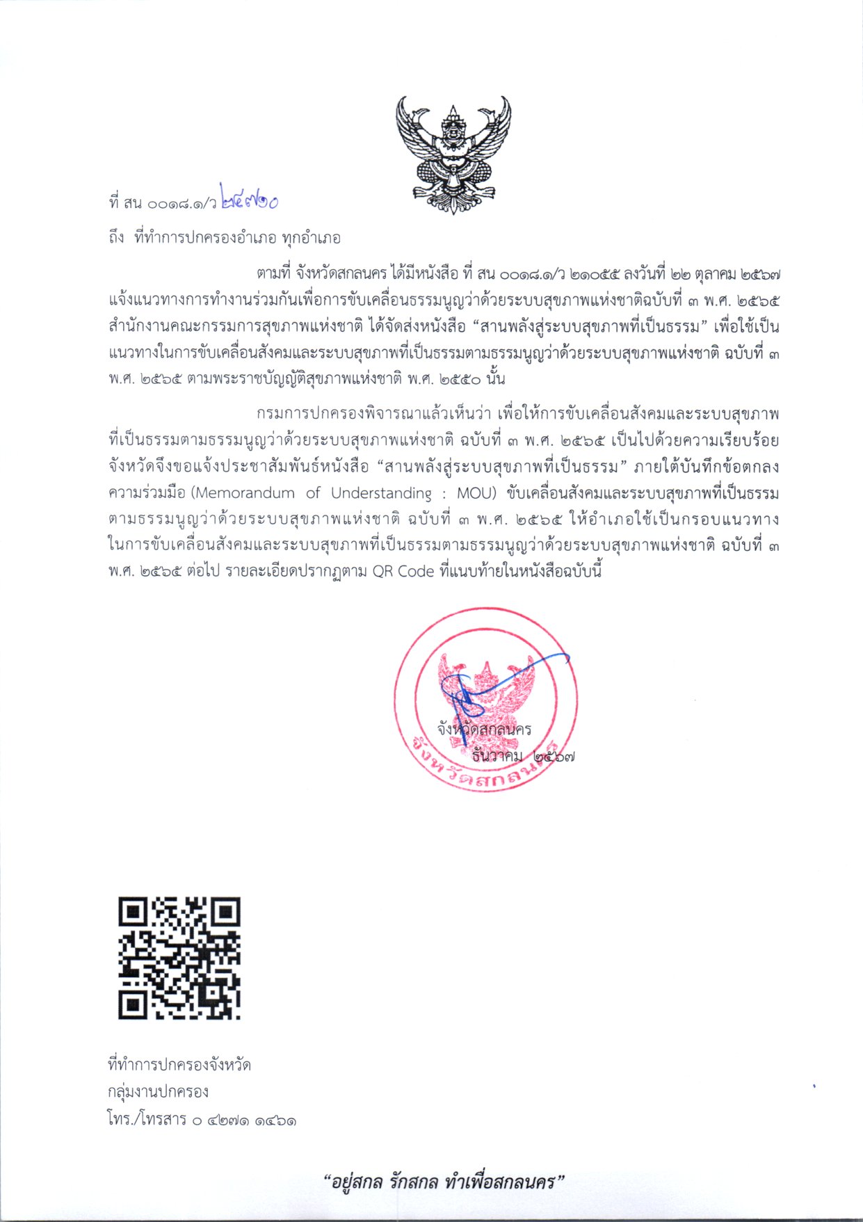 ที่ สน 0018.1/ว24710 ลงวันที่ 11 ธันวาคม 2567 เรียน ปลัดจังหวัดสกลนคร เรื่อง เเจ้งประชาสัมพันธ์หนังสือ “สานพลังสู่ระบบสุขภาพที่เป็นธรรม”๋ ภายใต้บันทึกตกลงความร่วมมือ (Menorandum of Understanding : MOU) ขับเคลื่อนสังคมและระบบสุขภาพที่เป็นธรรมตามธรรมนูญว่าด้วยระบบสุขภาพเเห่งชาติ ฉบับที่ 3 พ.ศ.2565 DopaAdmin11 ธันวาคม 24กลุ่มงานปกครอง, ข่าวประชาสัมพันธ์, ประกาศ/ระเบียบ/ดาวน์โหลด