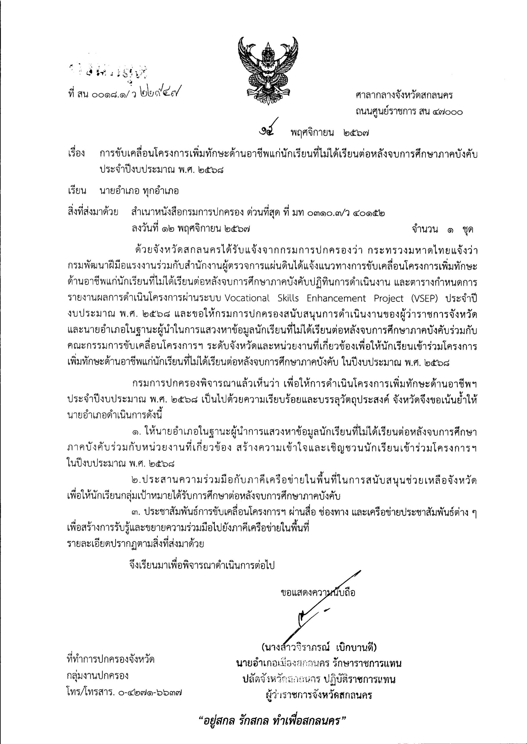 ที่ สน 0018.1/22947 ลงวันที่ 15 พฤศจิกายน 2567 เรียน นายอำเภอ ทุกอำเภอ เรื่อง การขับเคลื่อนโครงการเพิ่มทักษะด้านอาชีพแก่นักเรียนที่ไม่ได้เรียนต่อหลังจบการศึกษาภาคบังคับประจำปีงบประมาณ พ.ศ.2568 DopaAdmin15 พฤศจิกายน 24กลุ่มงานปกครอง, ประกาศ/ระเบียบ/ดาวน์โหลด