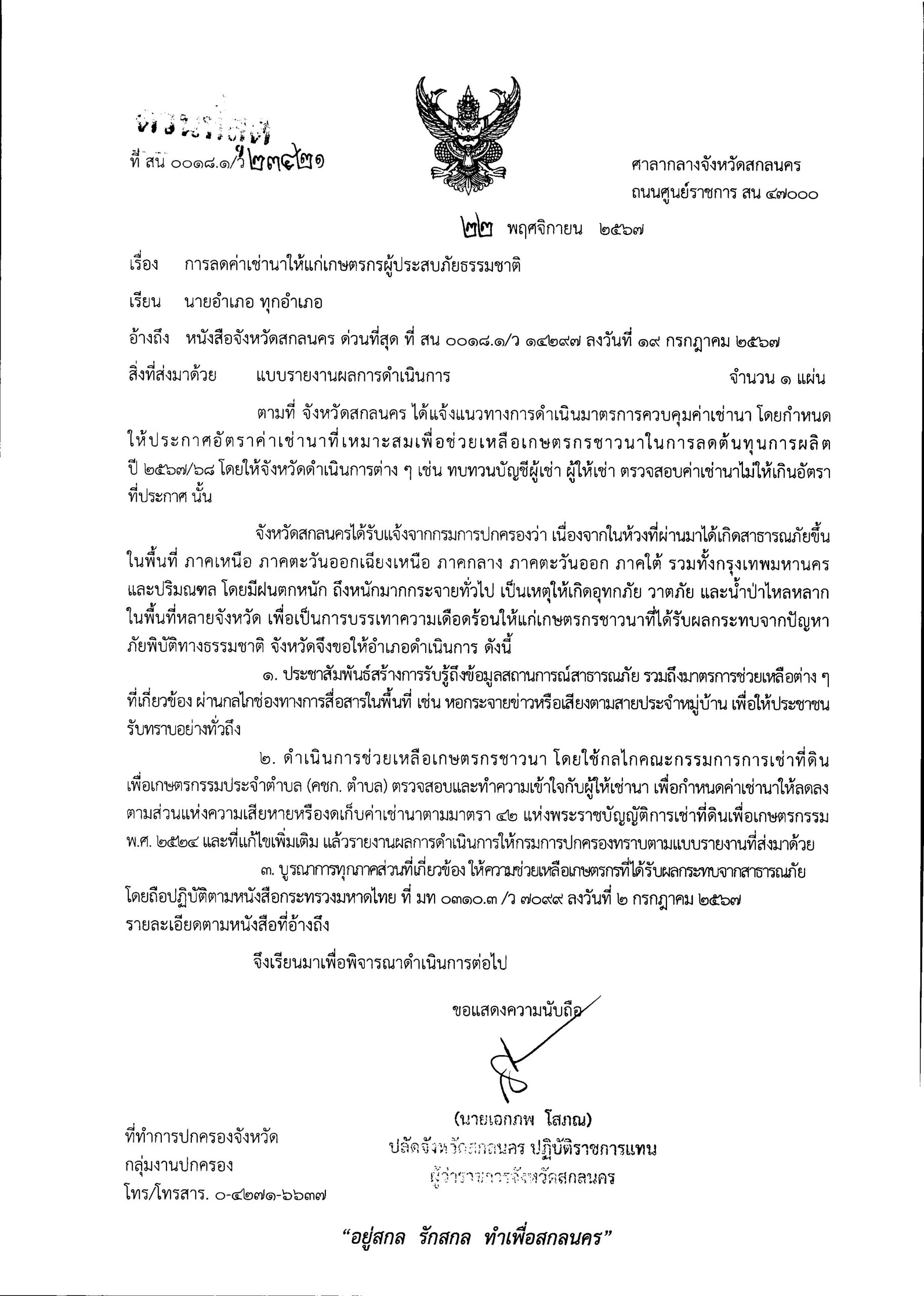หนังสือจังหวัดสกลนคร ด่วนที่สุด ที่ สน 0018.1/ว23421 ลงวันที่ 22 พฤศจิกายน 2567 เรื่อง การลดค่าเช่านาให้แก่เกษตรกรผู้ประสบภัยธรรมชาติ เรียน นายอำเภอ ทุกอำเภอ DopaAdmin22 พฤศจิกายน 24กลุ่มงานปกครอง, ข่าวประชาสัมพันธ์, ประกาศ/ระเบียบ/ดาวน์โหลด