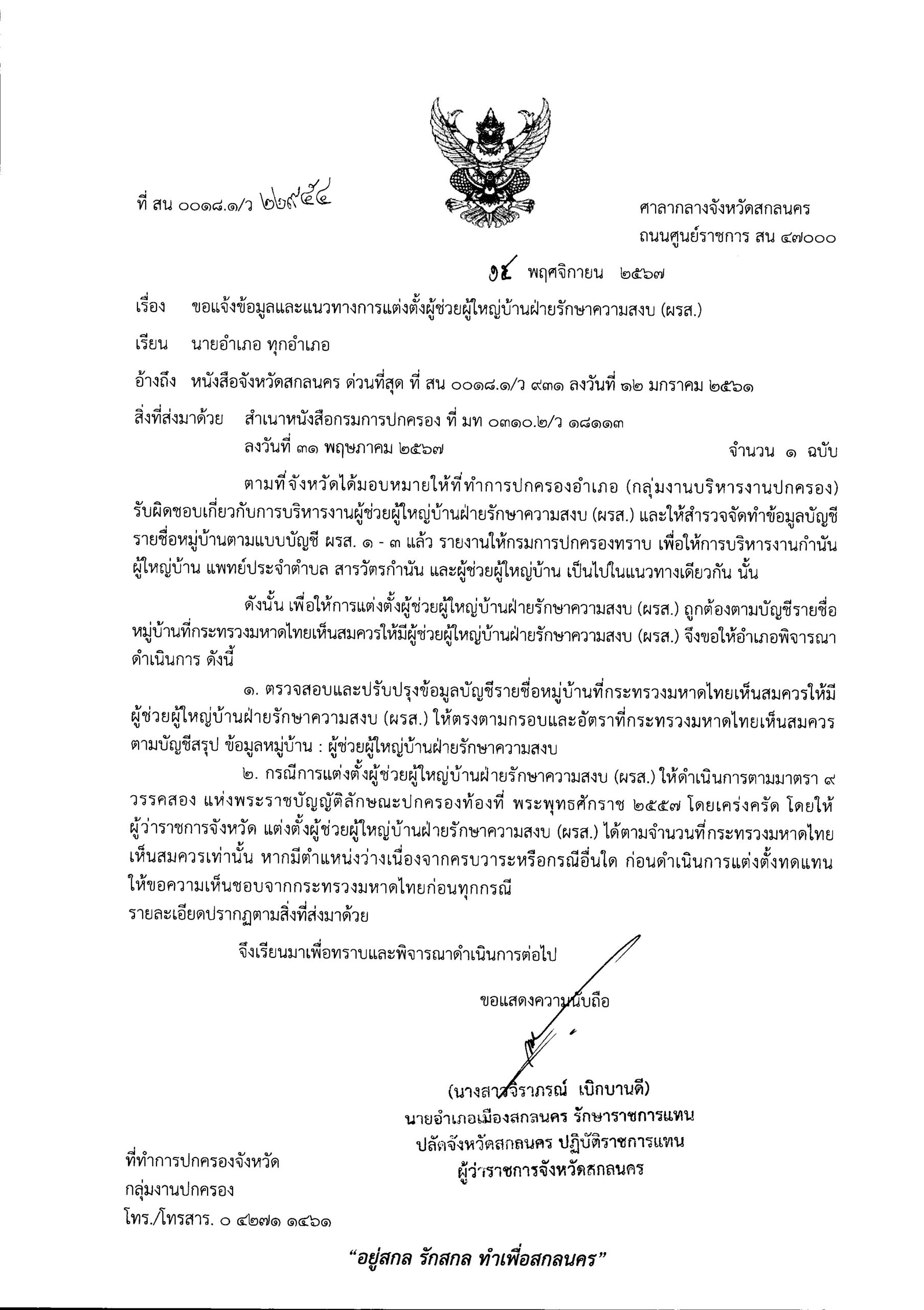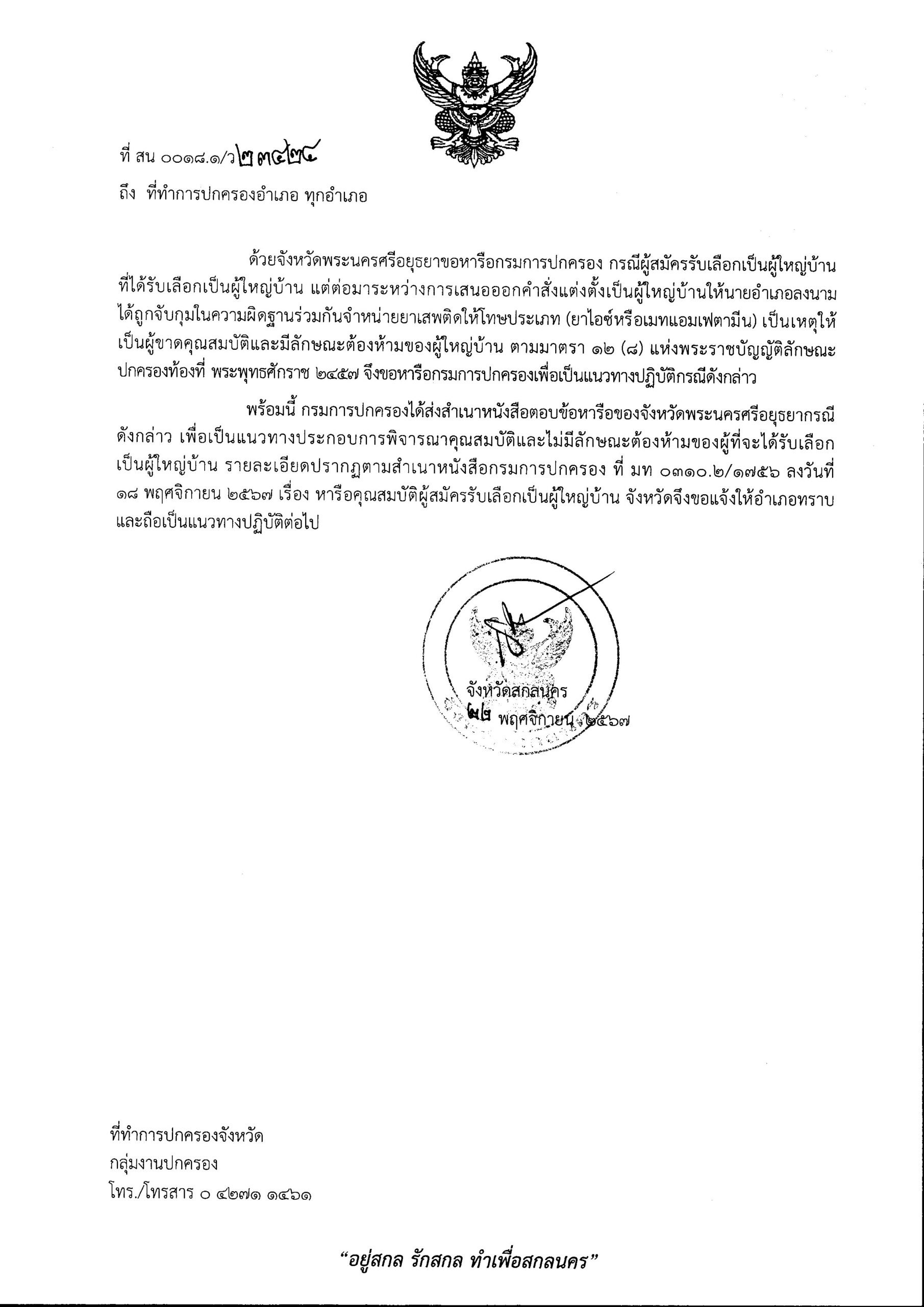 หนังสือจังหวัดสกลนคร ที่ สน 0018.1/ว23424 ลงวันที่ 22 พฤศจิกายน 2567 เรื่อง หารือกรณีผู้ได้รับเลือกเป็นผู้ใหญ่บ้านถูกจับกุมในคดีอาญาก่อนการออกคำสั่งแต่งตั้ง เรียน ที่ทำการปกครองอำเภอ ทุกอำเภอ DopaAdmin22 พฤศจิกายน 24กลุ่มงานปกครอง, ข่าวประชาสัมพันธ์, ประกาศ/ระเบียบ/ดาวน์โหลด
