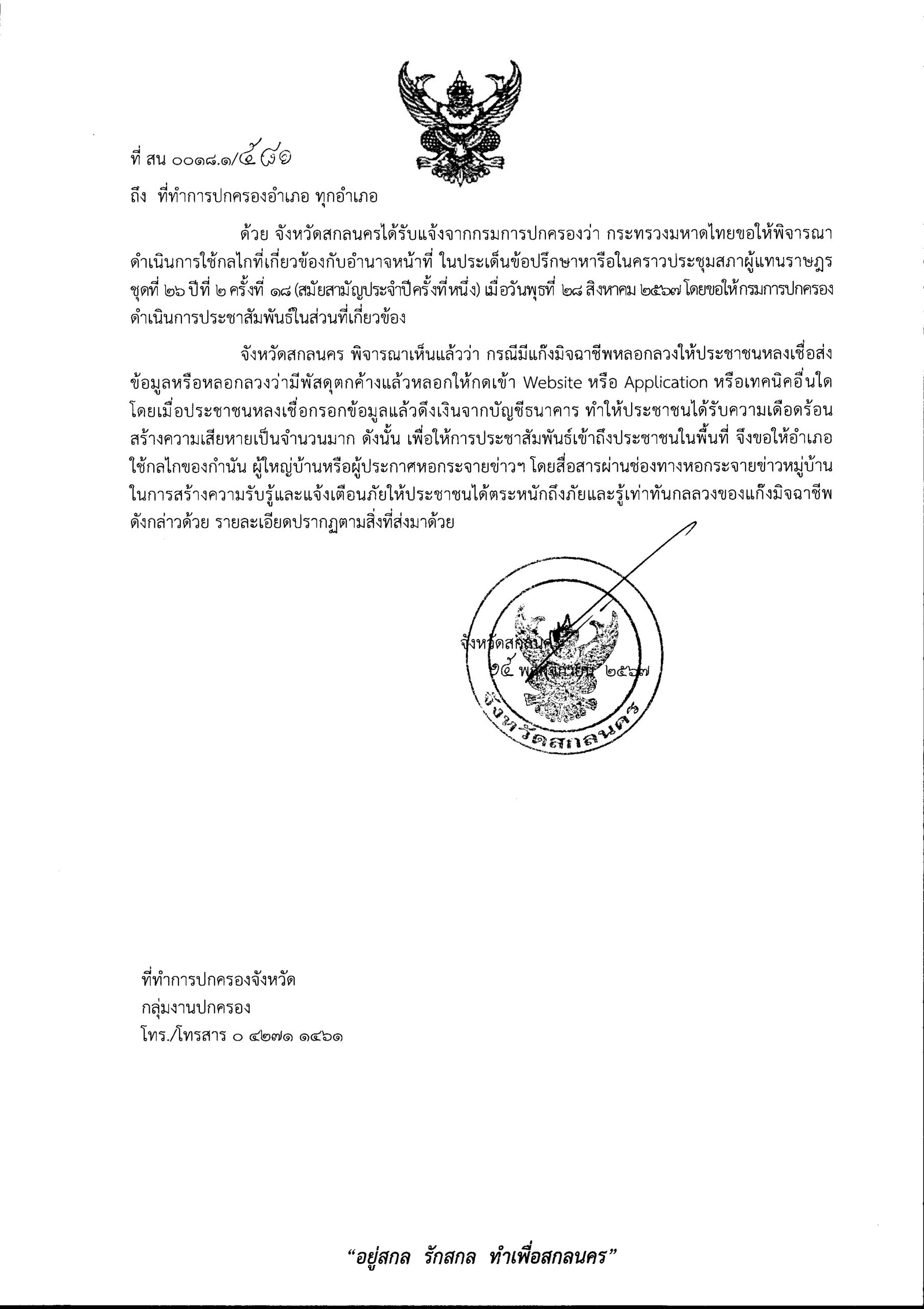 ที่ สน 0018.1/581 ลงวันที่ 15 พฤศจิกายน 2567 เรียน ปลัดจังหวัดสกลนคร เรื่อง การดำเนินการตามข้อหารือของสมาชิกสภาผู้แทนราษฎร DopaAdmin15 พฤศจิกายน 24กลุ่มงานปกครอง, ประกาศ/ระเบียบ/ดาวน์โหลด