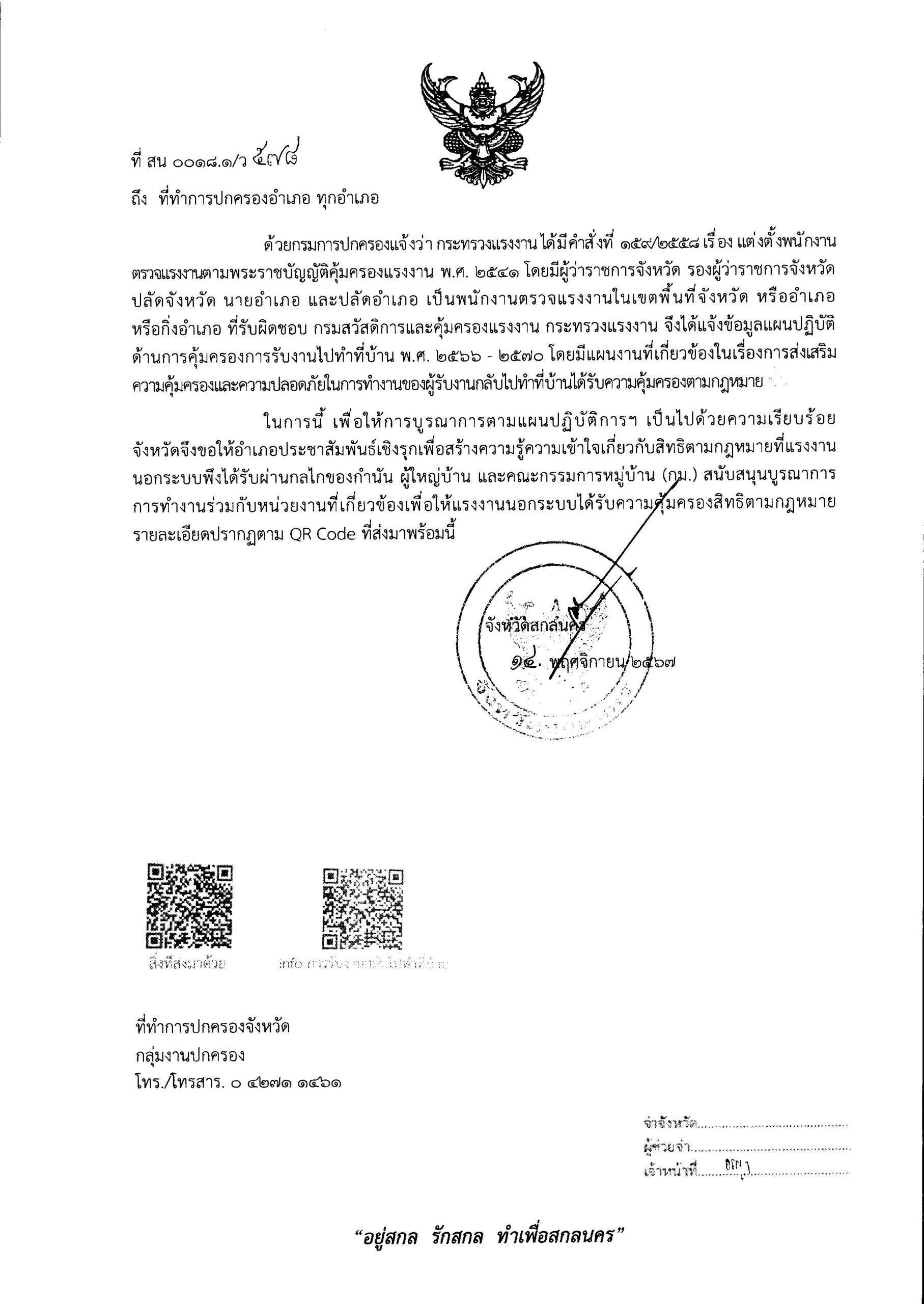 ที่ สน 0018.1/ว578 ลงวันที่ 14 พฤศจิกายน 2567 เรียน ที่ทำการปกครองอำเภอ ทุกอำเภอ เรื่อง แต่งตั้งพนักงานตรวจแรงงานตามพระราชบัญญัติคุ้มครองแรงงาน พ.ศ. 2541 DopaAdmin14 พฤศจิกายน 24กลุ่มงานปกครอง, ข่าวประชาสัมพันธ์, ประกาศ/ระเบียบ/ดาวน์โหลด