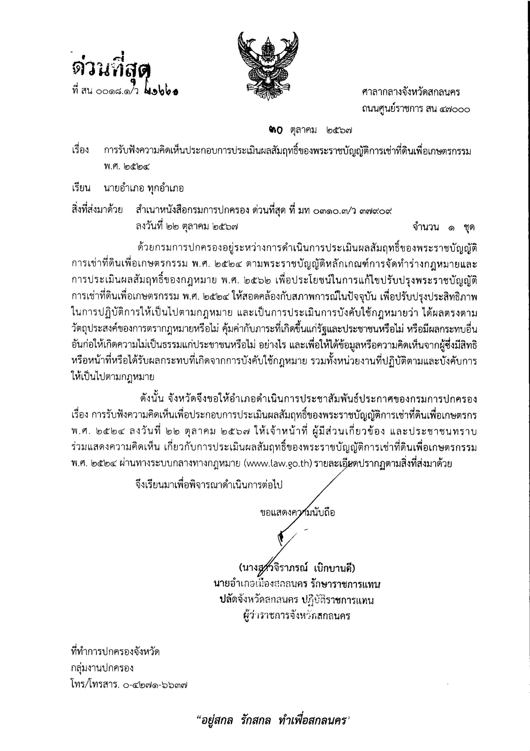 ด่วนที่สุด ที่ สน 0018.1/ว 21660 ลงวันที่ 30 ตุลาคม 2567 เรียน นอ.ทุกอำเภอ เรื่อง การรับฟังความคิดเห็นประกอบการประเมินผลสัมฤทธิ์ของพระราชบัญญัติการเช่าที่ดินเพื่อเกษตรกรรม พ.ศ. 2524 DopaAdmin31 ตุลาคม 24กลุ่มงานปกครอง, ประกาศ/ระเบียบ/ดาวน์โหลด