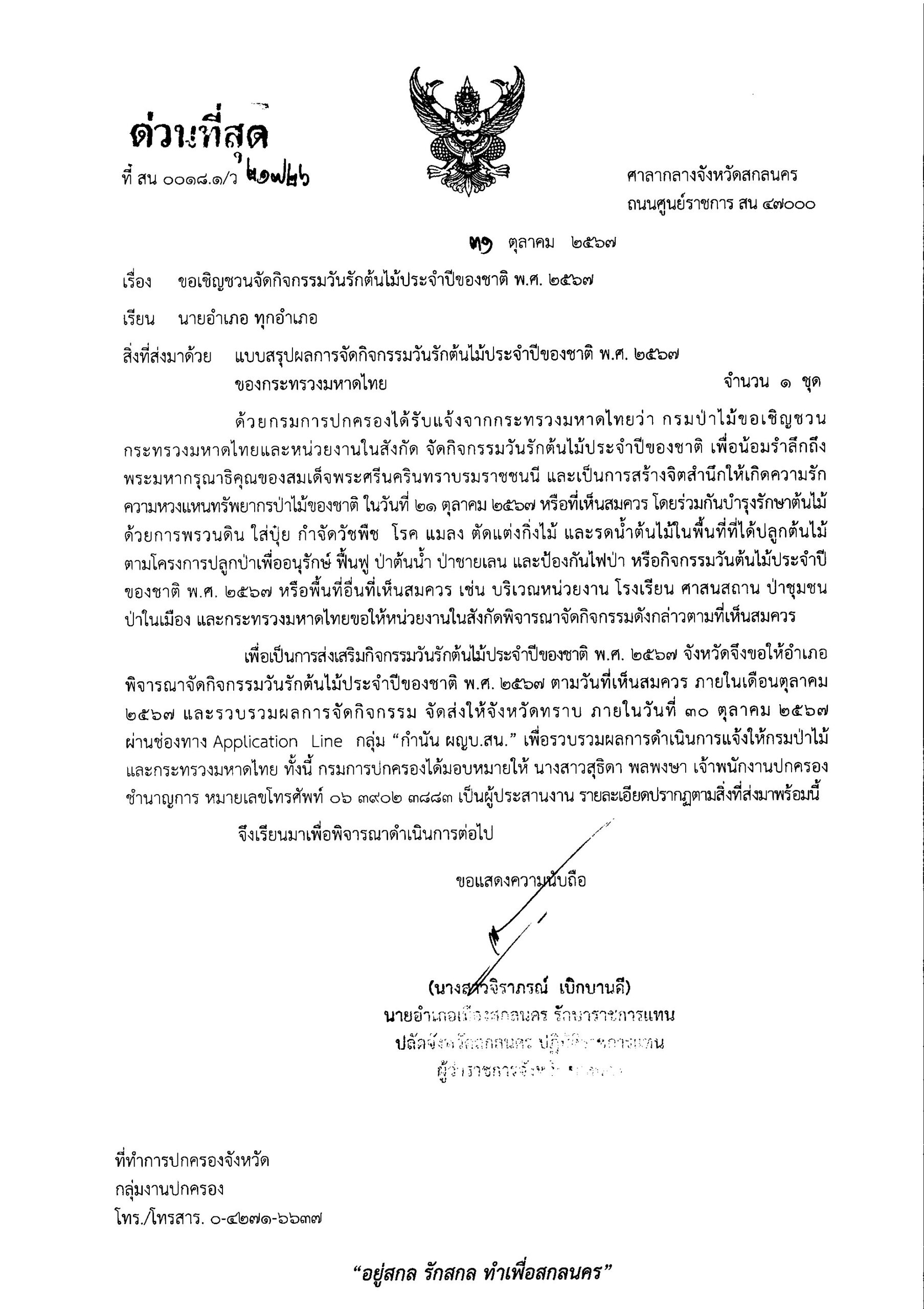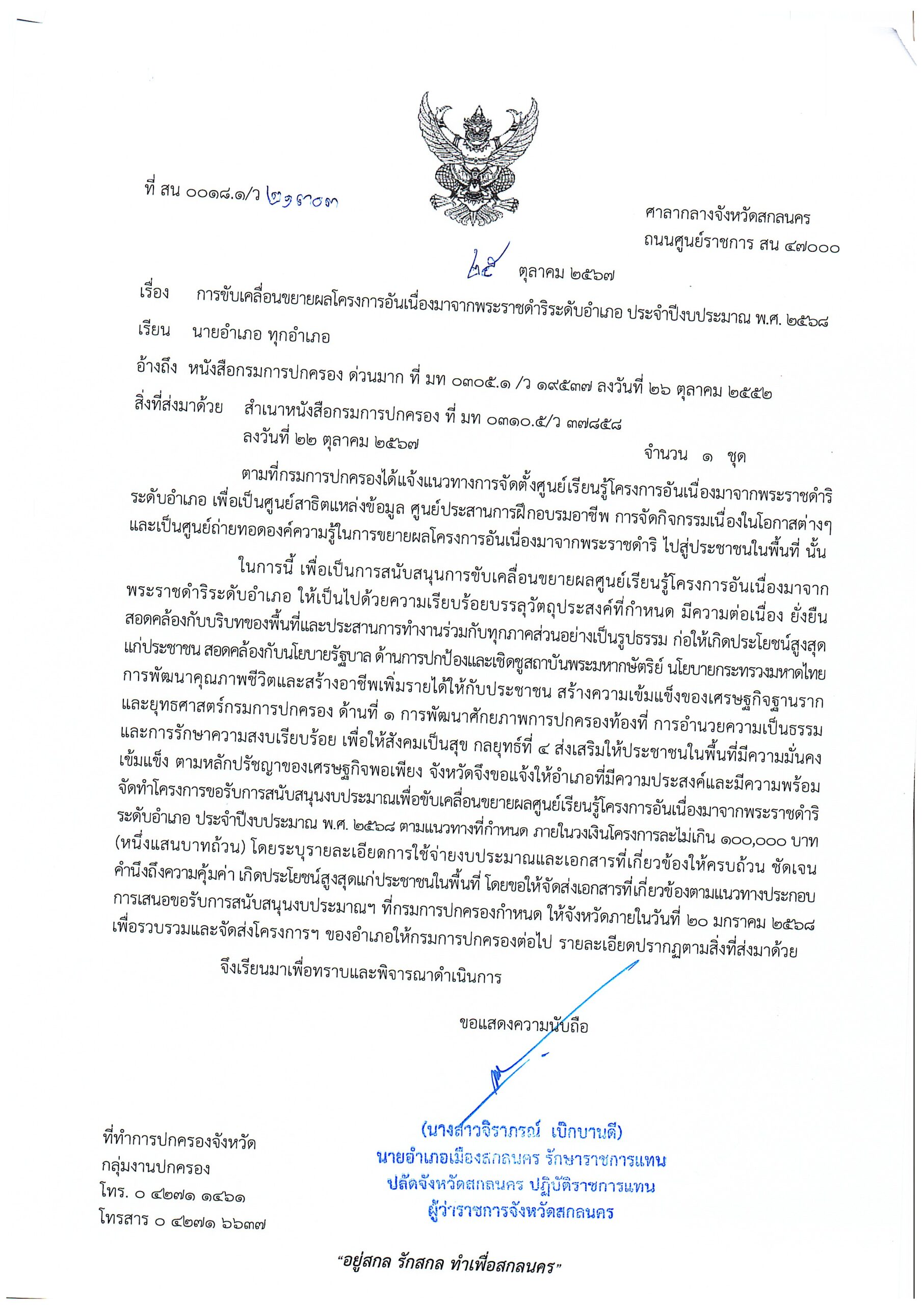หนังสือจังหวัดสกลนคร ที่ สน 0018.1/ว 21303 ลงวันที่ 25 ตุลาคม 2567 เรื่อง การขับเคลื่อนขยายผลโครงการอันเนื่องมาจากพระราชดำริระดับอำเภอ ประจำปีงบประมาณ พ.ศ. 2568 เรียน นายอำเภอ ทุกอำเภอ DopaAdmin25 ตุลาคม 24กลุ่มงานปกครอง, ข่าวประชาสัมพันธ์, ประกาศ/ระเบียบ/ดาวน์โหลด