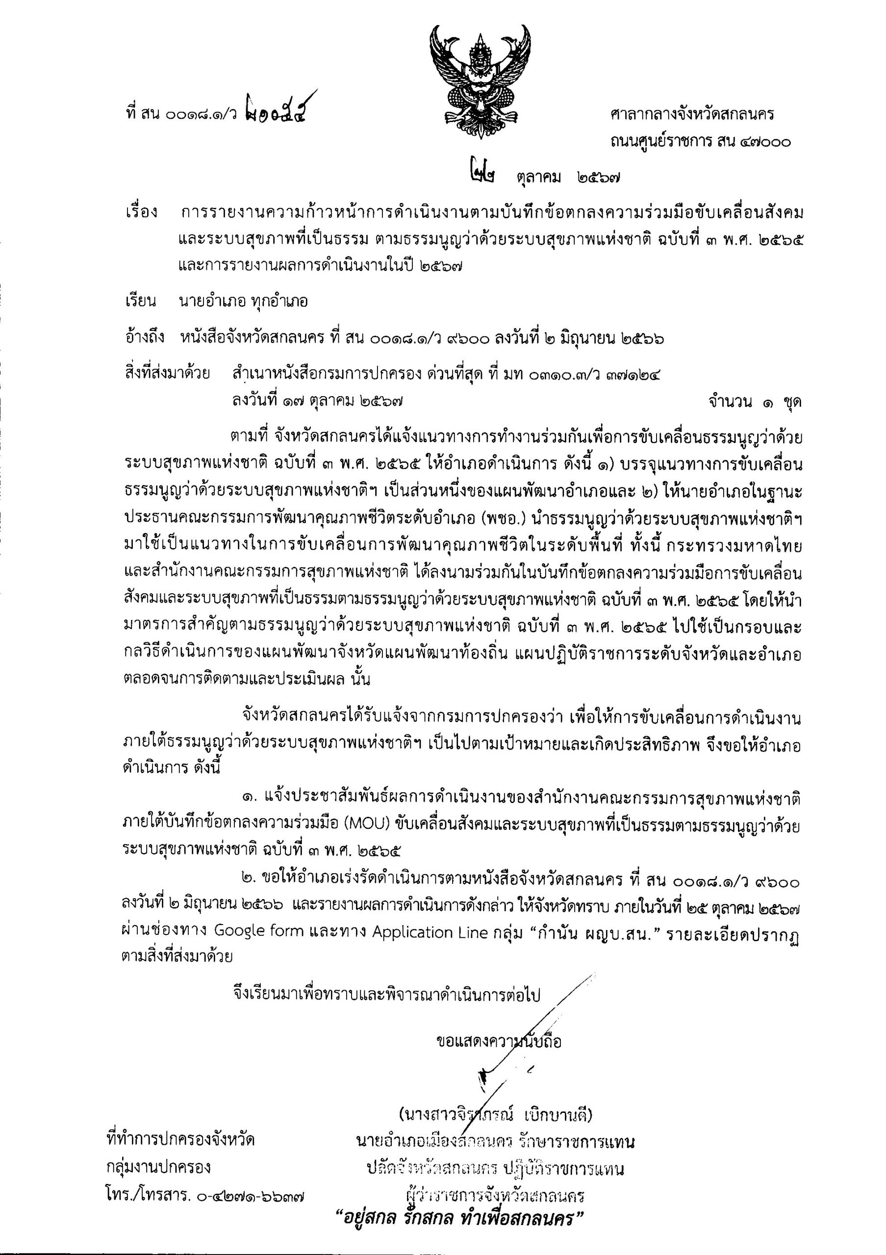 ที่ สน 0018.1/ว 21055 ลงวันที่ 22 ตุลาคม 2567 เรียน นอ. ทุกอำเภอ เรื่อง การรายงานความก้าวหน้าการดำเนินงานตามบันทึกข้อตกลงความร่วมมือขับเคลื่อนสังคมและระบบสุขภาพที่เป็นธรรม ตามรัฐธรรมนูญว่าด้วยระบบสุขภาพแห่งชาติ ฉบับที่ 3 พ.ศ. 2565 และรายงานผลการดำเนินงานในปี 2567 DopaAdmin22 ตุลาคม 24กลุ่มงานปกครอง, ประกาศ/ระเบียบ/ดาวน์โหลด
