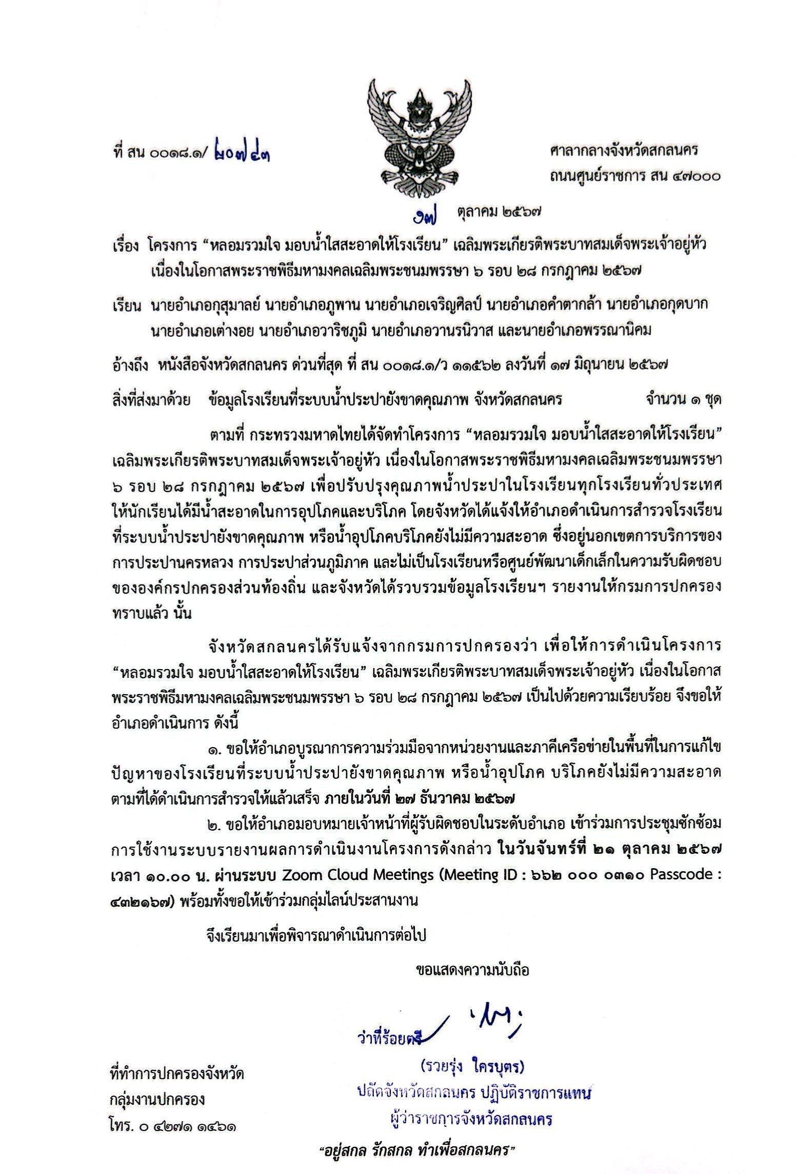 ที่ สน 0018.1/20743 ลงวันที่ 17 ตุลาคม 2567 เรียน นายอำเภอกุสุมาลย์ นายอำเภอภูพาน นายอำเภอเจริญศิลป์ นายอำเภอคำตากล้า นายอำเภอกุดบาก นายอำเภอเต่างอย นายเภอวาชภูมิ นายอำเภอวานรนิวาส และนายอำเภอพรรณานิคม เรื่อง โครงการ “หลอมรวมใจ มอบน้ำใจใสสะอาดให้โรงเรียน” เฉลิมพรเกียรติพระบาทสมเด็จพระเจ้าอยู่หัว เนื่องในโอกาสพระราชพิธีมหามงคลเฉลิมพระชนมพรรษา 6 รอบ 28 กรกฎาคม 2567 DopaAdmin17 ตุลาคม 24กลุ่มงานปกครอง, ประกาศ/ระเบียบ/ดาวน์โหลด