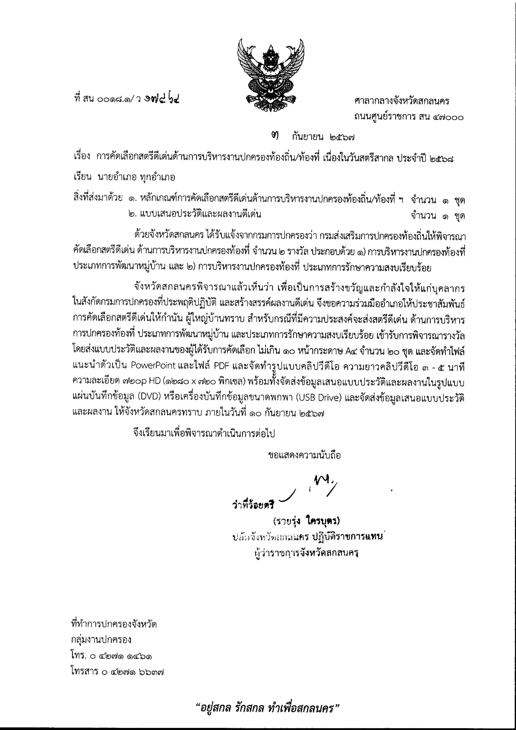 หนังสือจังหวัดสกลนคร ด่วนที่สุด ที่ สน 0018.1/ว17508 ลงวันที่ 4 กันยายน 2567 เรียน นายอำเภอเมืองสกลนคร นายอำเภอวานรนิวาส และนายอำเภอกุสุมาลย์ เรื่อง โครงการคัดเลือกหมู่บ้านเข้มแข็งตามแนวทาง “แผ่นดินธรรม แผ่นดินทอง” (หมู่บ้าน อยู่เย็น) ประจำปีงบประมาณ พ.ศ. 2567 DopaAdmin4 กันยายน 24กลุ่มงานปกครอง, ข่าวประชาสัมพันธ์, ประกาศ/ระเบียบ/ดาวน์โหลด