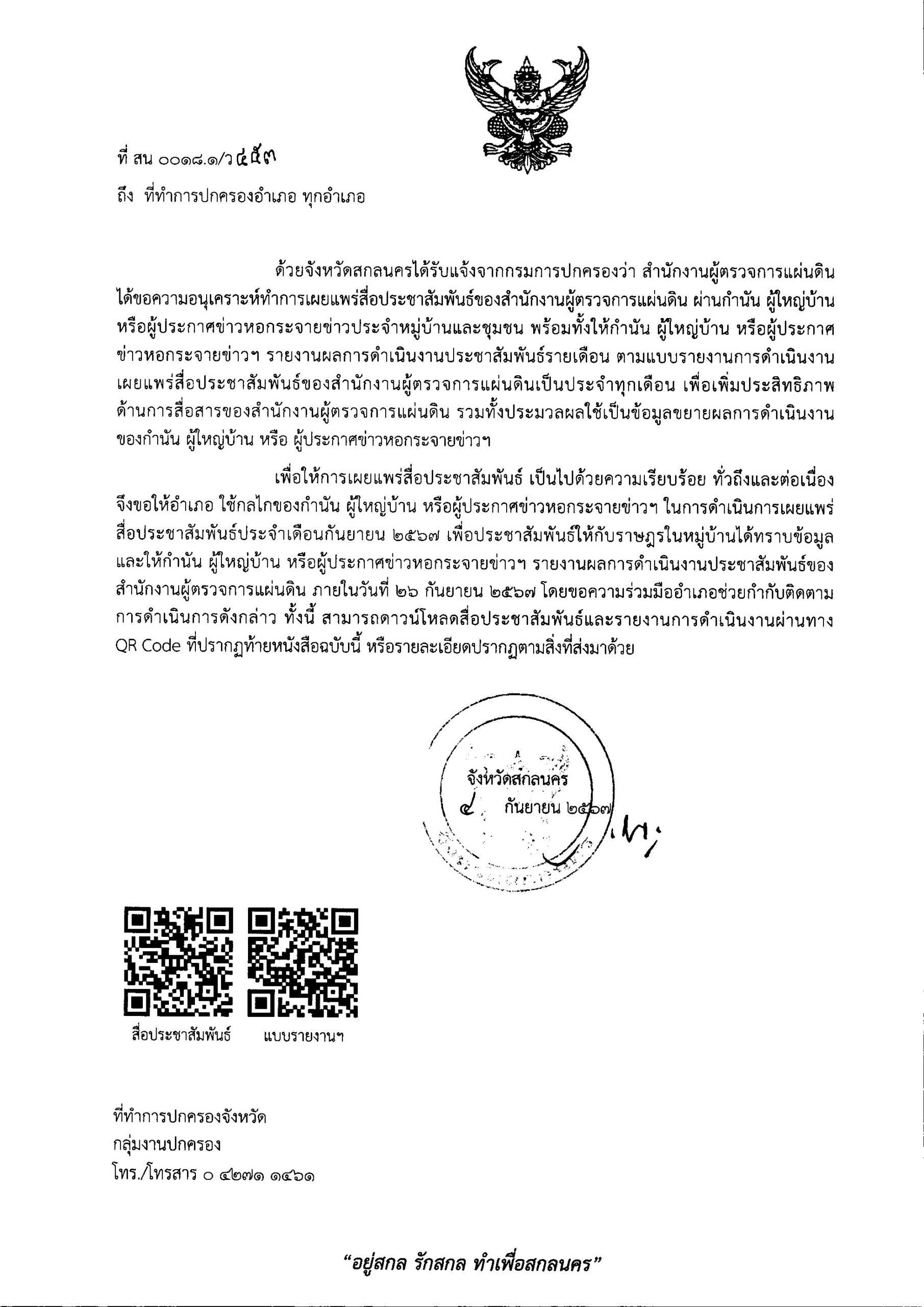 ด่วนที่สุด ที่ สน 0018.1/ว18000 ลว 10 ก.ย. 2567 เรียน นอ.สว่างแดนดิน นอ.วานรนิวาส นอ.บ้านม่วง นอ.คำตากล้า และ นอ.ส่องดาว เรื่อง การดำเนินงานตามโครงการงบประมาณรายจ่ายของจังหวัดสกลนคร โดยใช้เงินเหลือจ่าย (โครงการบัญชีสำรอง Y2) ประจำปีงบประมาณ พ.ศ. 2567 : โครงการเพิ่มประสิทธิภาพบริหารจัดการในระดับหมู่บ้านเพื่อสนับสนุนนโยบายของรัฐบาล กิจกรรมที่ 1 : ฝึกอบรมเพิ่มประสิทธิภาพกรรมการหมู่บ้าน (กม.) ผู้ทรงคุณวุฒิ เพื่อจัดทำแผนพัฒนาหมู่บ้านและส่งเสริมให้ราษฎรมีส่วนร่วมในการปกครองระบอบประชาธิปไตย กิจกรรมที่ 1.1 ฝึกอบรมเพิ่มประสิทธิภาพกรรมการหมู่บ้าน (กม.) ผู้ทรงคุณวุฒิ ในการจัดทำแผนพัฒนาหมู่บ้าน เพื่อรองรับการเชื่อมโยงแผนในระดับพื้นที่ (One Plan) DopaAdmin10 กันยายน 24กลุ่มงานปกครอง, ประกาศ/ระเบียบ/ดาวน์โหลด