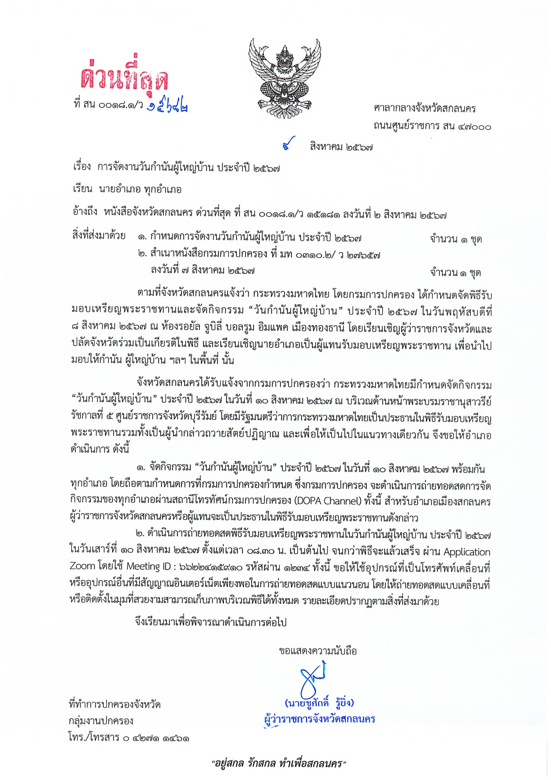 ที่ สน 0018.1/ว 15960 ลงวันที่ 14 สิงหาคม 2567 เรียน นายอำเภอกุดบาก และนายอำเภอนิคมน้ำอูน เรื่อง มอบหมายให้พนักงานราชการปฏิบัติหน้าที่ DopaAdmin14 สิงหาคม 24กลุ่มงานปกครอง, ประกาศ/ระเบียบ/ดาวน์โหลด