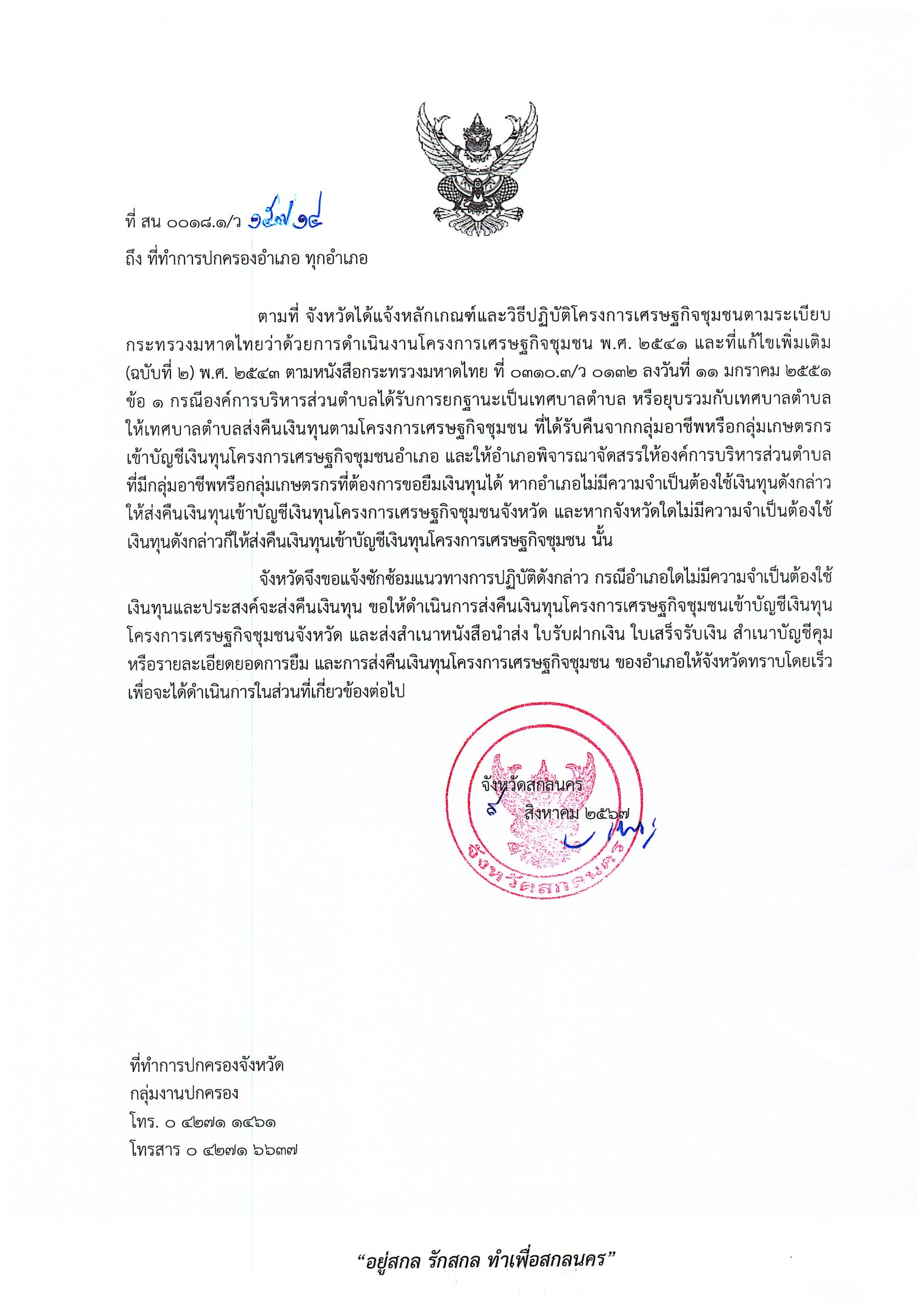 ที่สน 0018.1/ว 15714 ลงวันที่ 9 สิงหาคม 2567 เรียน นายอำเภอ ทุกอำเภอ เรื่อง การดำเนินการตามโครงการเศรษฐกิจชุมชน DopaAdmin9 สิงหาคม 24กลุ่มงานปกครอง, ประกาศ/ระเบียบ/ดาวน์โหลด