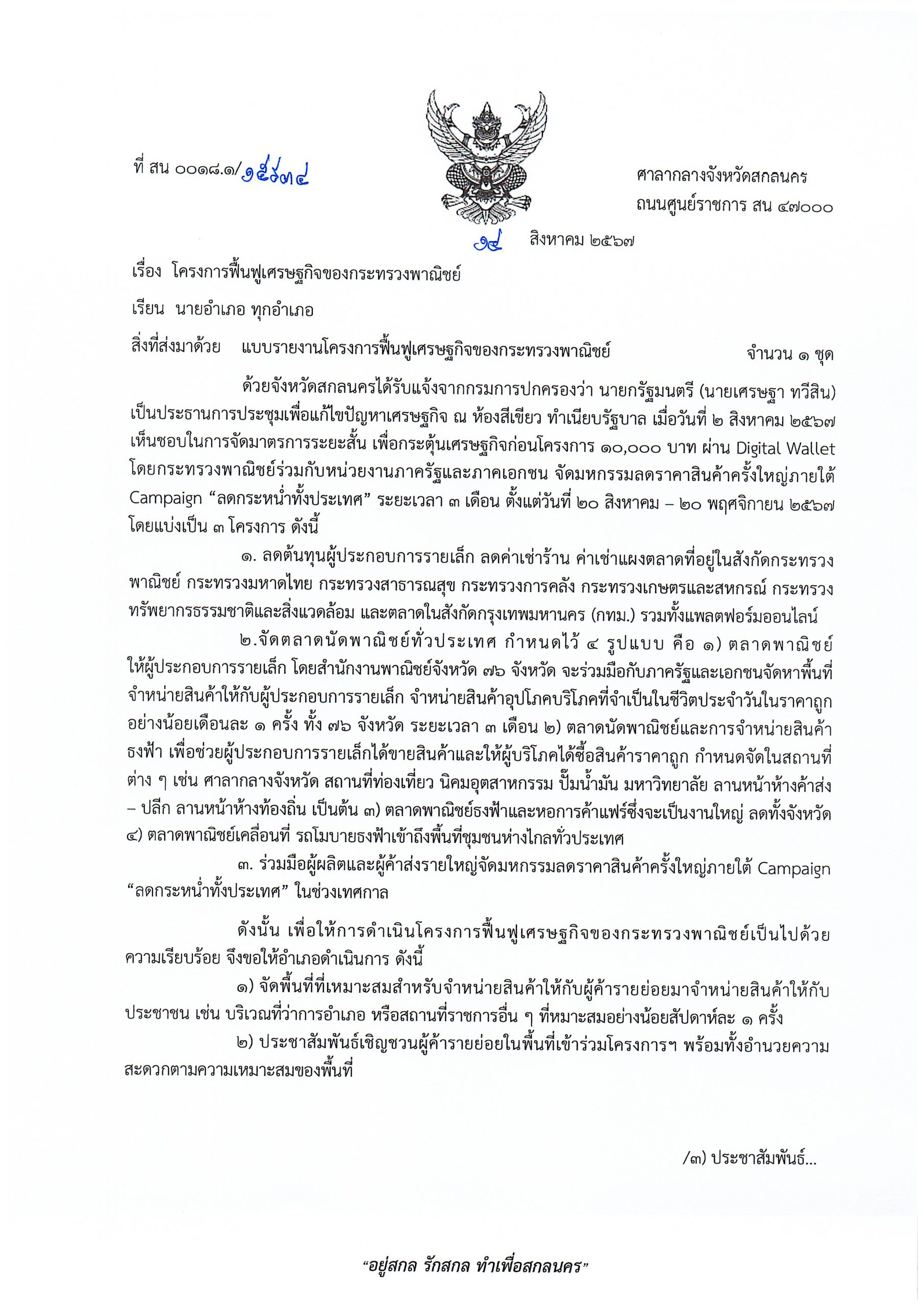 ที่สน 0018.1/14934 ลงวันที่ 14 สิงหาคม เรียน นายอำเภอ ทุกอำเภอ เรื่อง โครงการฟื้นฟูเศรษฐกิจของกระทรวงพาณิชย์ DopaAdmin14 สิงหาคม 24กลุ่มงานปกครอง, ประกาศ/ระเบียบ/ดาวน์โหลด