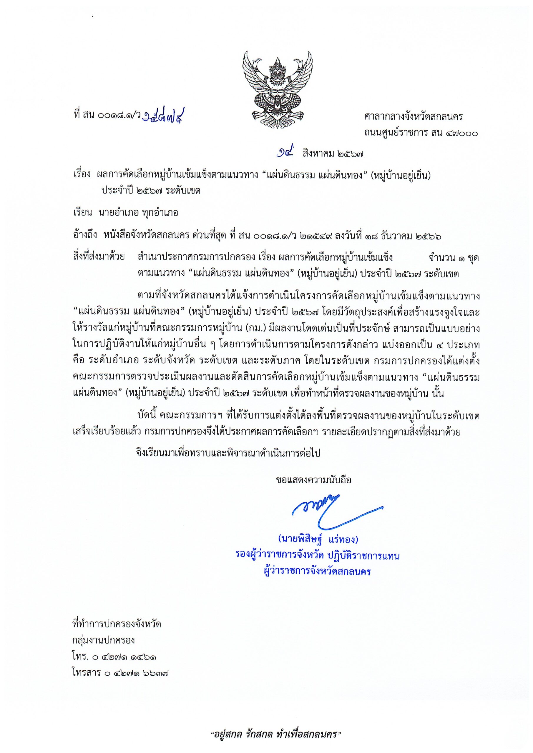 หนังสือจังหวัดสกลนคร ด่วนที่สุด ที่ สน 0018.1/ว 15441 เรียน นายอำเภอ ทุกอำเภอ เรื่อง ผลการคัดเลือกหมู่บ้านต้นแบบประชาธิปไตยดีเด่น ประจำปีงบประมาณ พ.ศ. 2567 ลงวันที่ 6 สิงหาคม 2567 DopaAdmin7 สิงหาคม 24กลุ่มงานปกครอง, ข่าวประชาสัมพันธ์, ประกาศ/ระเบียบ/ดาวน์โหลด