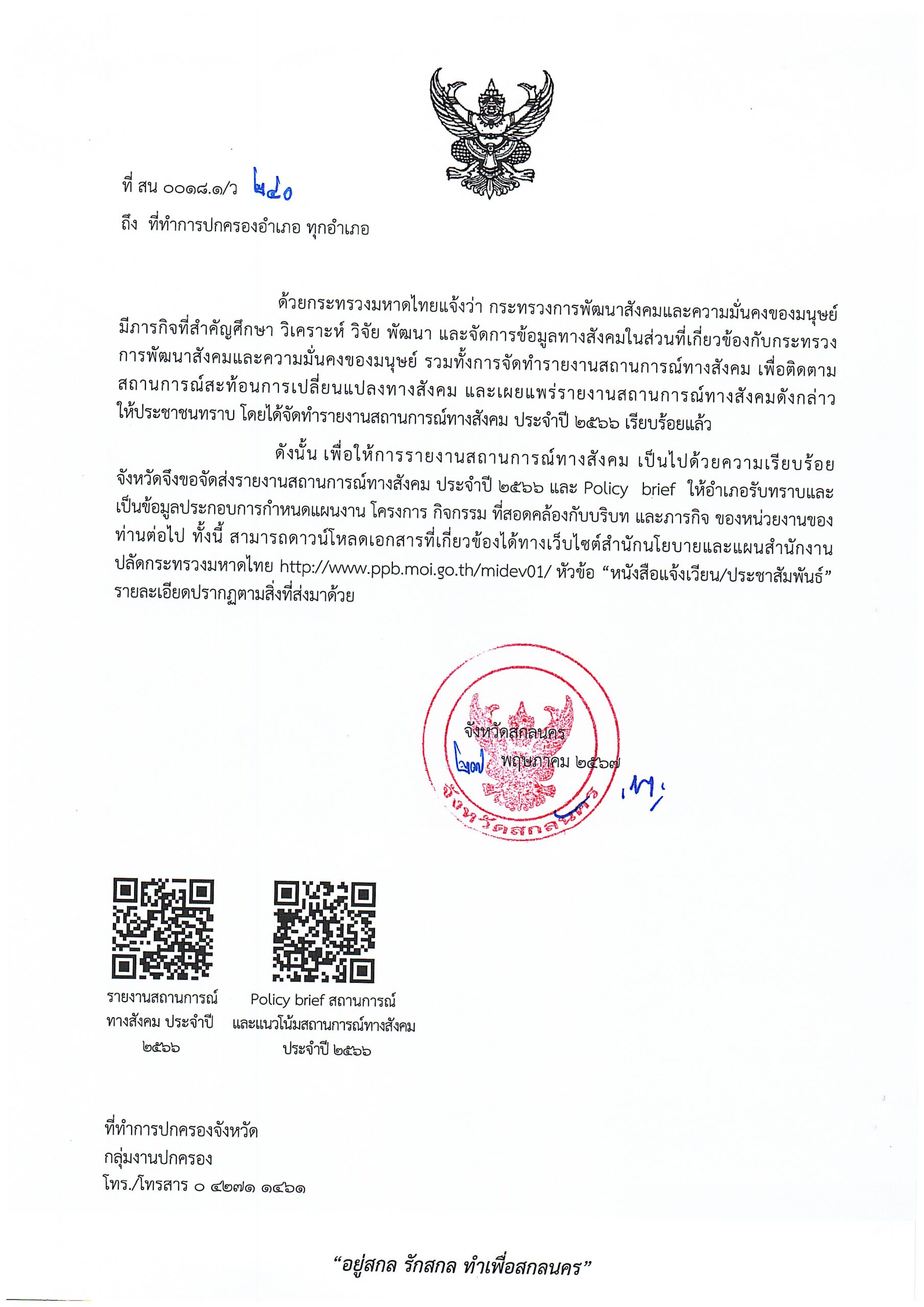 ที่ สน 0018.1/ว 240 ลงวันที่ 27 พฤษภาคม 2567 ถึง ที่ทำการปกครองอำเภอ ทุกอำเภอ เรื่อง ขอจัดส่งรายงานสภานการณ์ทางสังคม ประจำปี 2566 และ Policy brief DopaAdmin27 พฤษภาคม 24กลุ่มงานปกครอง, ประกาศ/ระเบียบ/ดาวน์โหลด