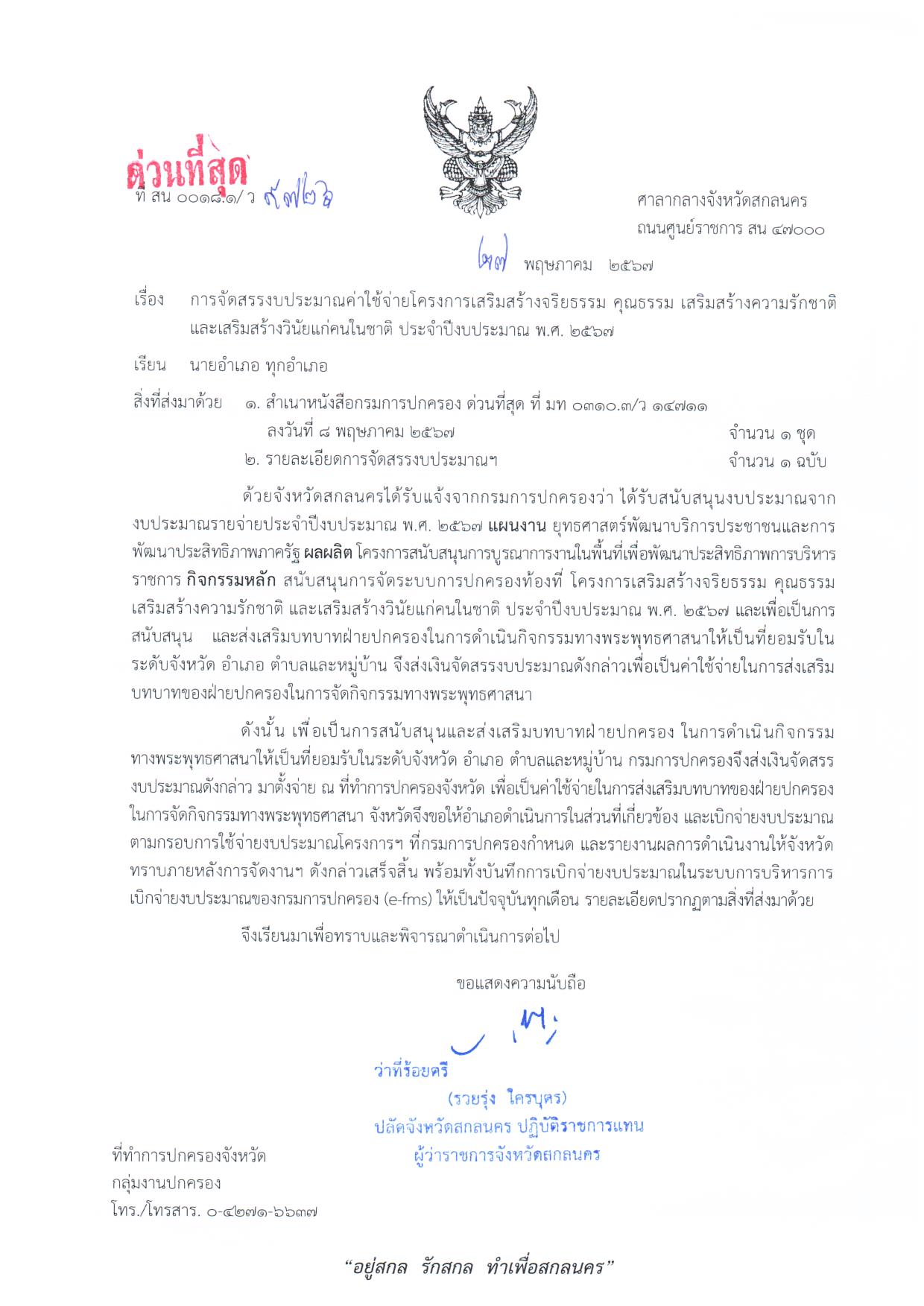 หนังสือจังหวัดสกลนคร ด่วนที่สุด ที่ สน 0018.1/ว 9726 ลงวันที่ 27 พฤษภาคม 2567 เรียน นายอำเภอ ทุกอำเภอ เรื่อง การจัดสรรงบประมาณค่าใช้จ่ายโครงการเสริมสร้างจริยธรรม คุณธรรม เสริมสร้างความรักชาติ และเสริมสร้างวินัยแก่คนในชาติ ประจำปีงบประมาณ พ.ศ. 2567 DopaAdmin27 พฤษภาคม 24กลุ่มงานปกครอง, ข่าวประชาสัมพันธ์, ประกาศ/ระเบียบ/ดาวน์โหลด