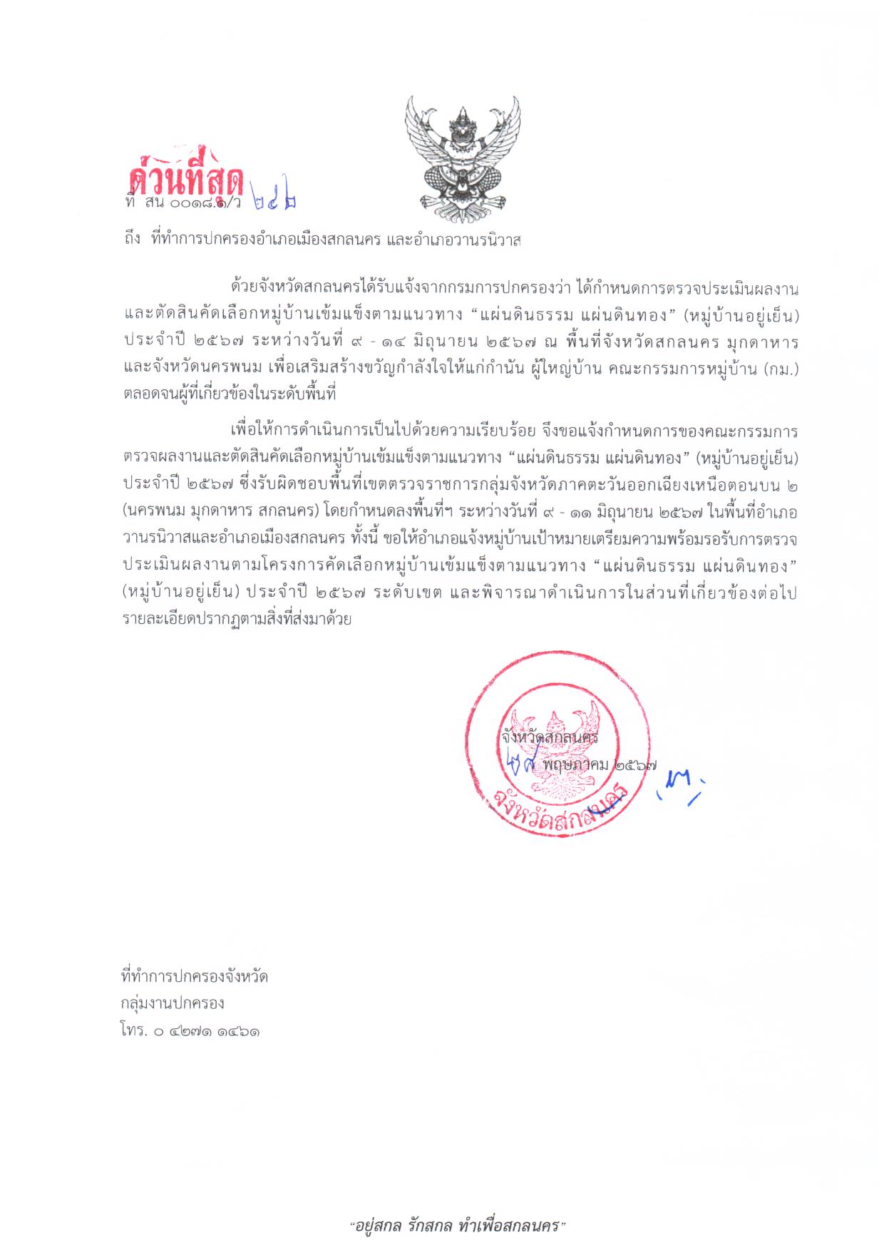 หนังสือจังหวัดสกลนคร ด่วนที่สุด ที่ สน 0018.1/ว 242 ลงวันที่ 28 พฤษภาคม 2567 เรียน นายอำเภอเมืองสกลนคร และนายอำเภอสว่างแดนดิน เรื่อง กำหนดการตรวจประเมินผลงานและตัดสินการคัดเลือกหมู่บ้านเข้มแข็งตามแนวทาง “แผ่นดินธรรม แผ่นดินทอง” (หมู่บ้านอยู่เย็น) ประจำปี 2567 ระดับเขต DopaAdmin28 พฤษภาคม 24กลุ่มงานปกครอง, ข่าวประชาสัมพันธ์, ประกาศ/ระเบียบ/ดาวน์โหลด