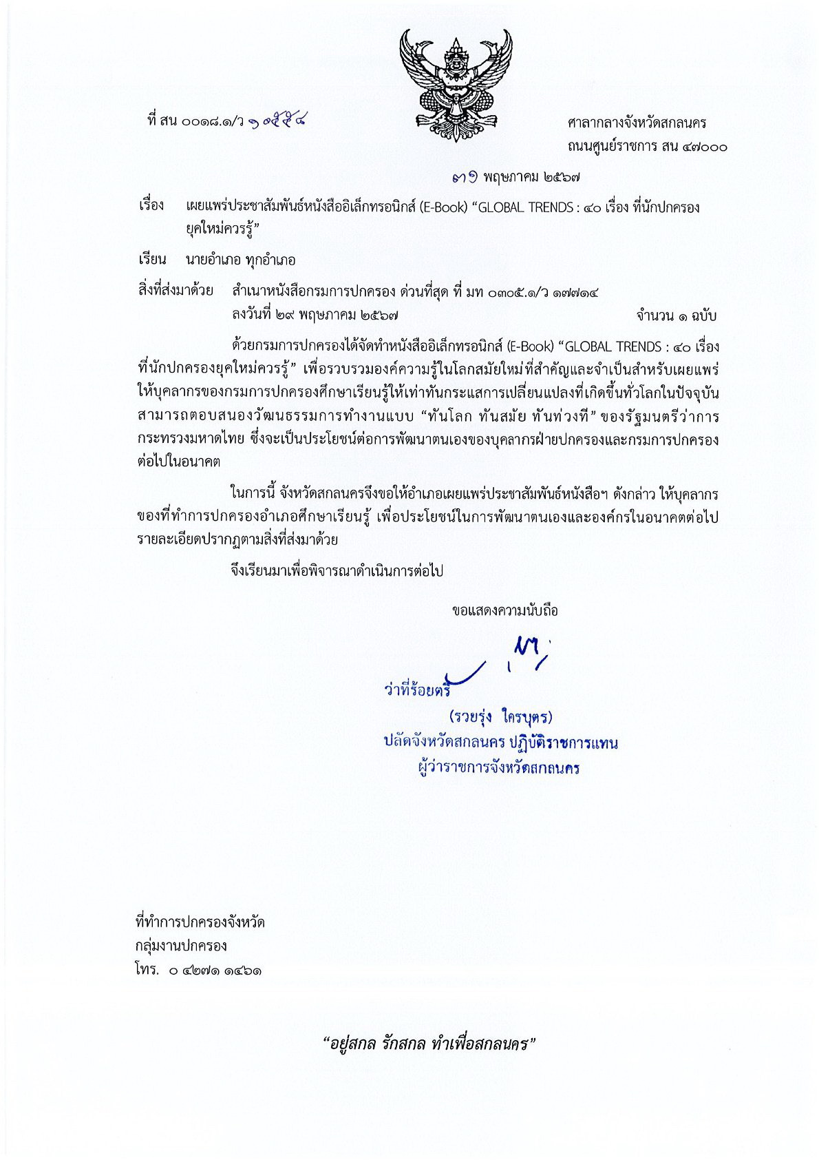 ที่ สน 0018.1/ว 10558 ลงวันที่ 31 พฤษภาคม 2567 เรียน นายอำเภอ ทุกอำเภอ เรื่อง เผยแพร่ประชาสัมพันธ์หนังสืออิเล็กทรอนิกส์ (E-BooK) “GLOBAL TRENDS : 40 เรื่อง ที่นักปกครองยุคใหม่ควรรู้” DopaAdmin5 มิถุนายน 24กลุ่มงานปกครอง, ประกาศ/ระเบียบ/ดาวน์โหลด