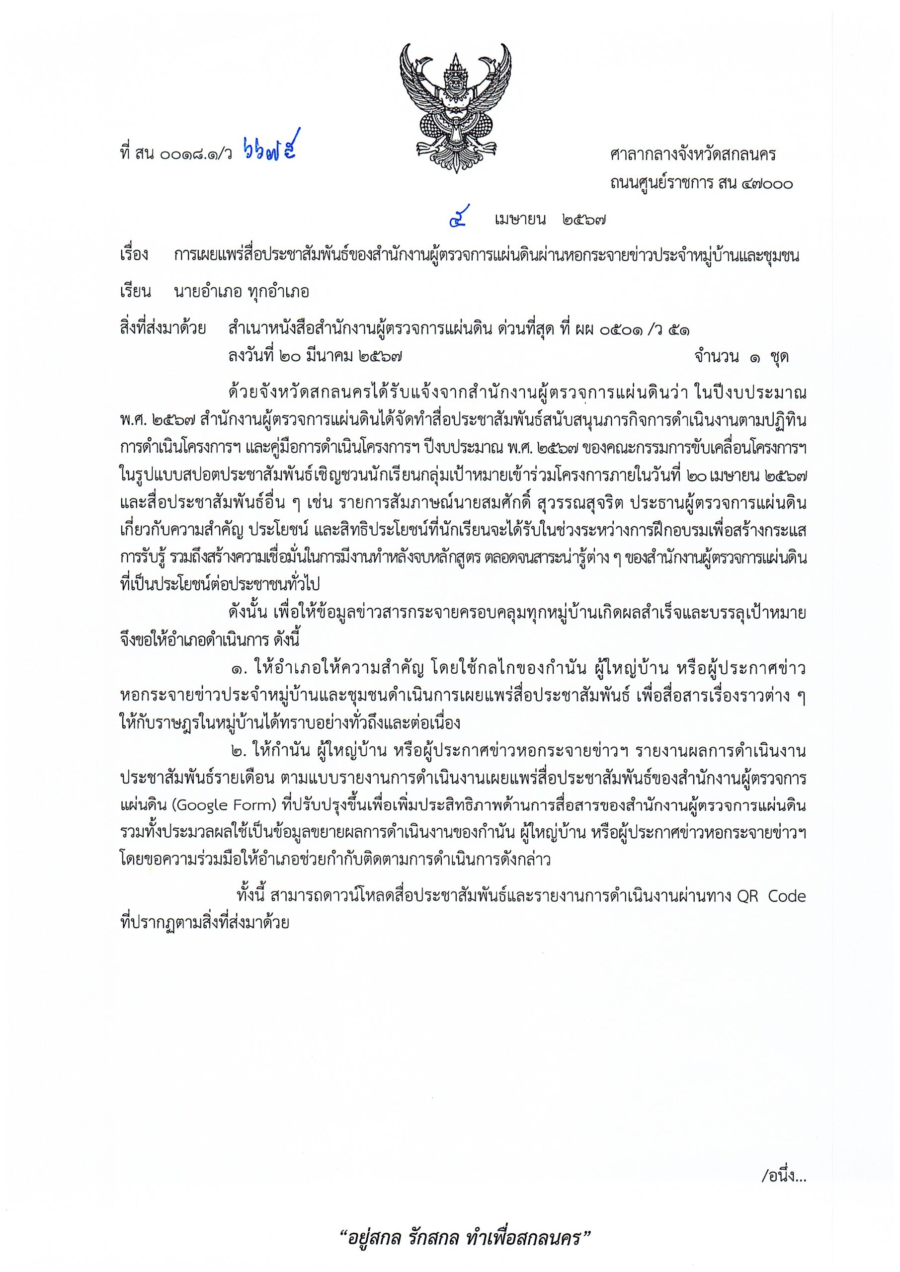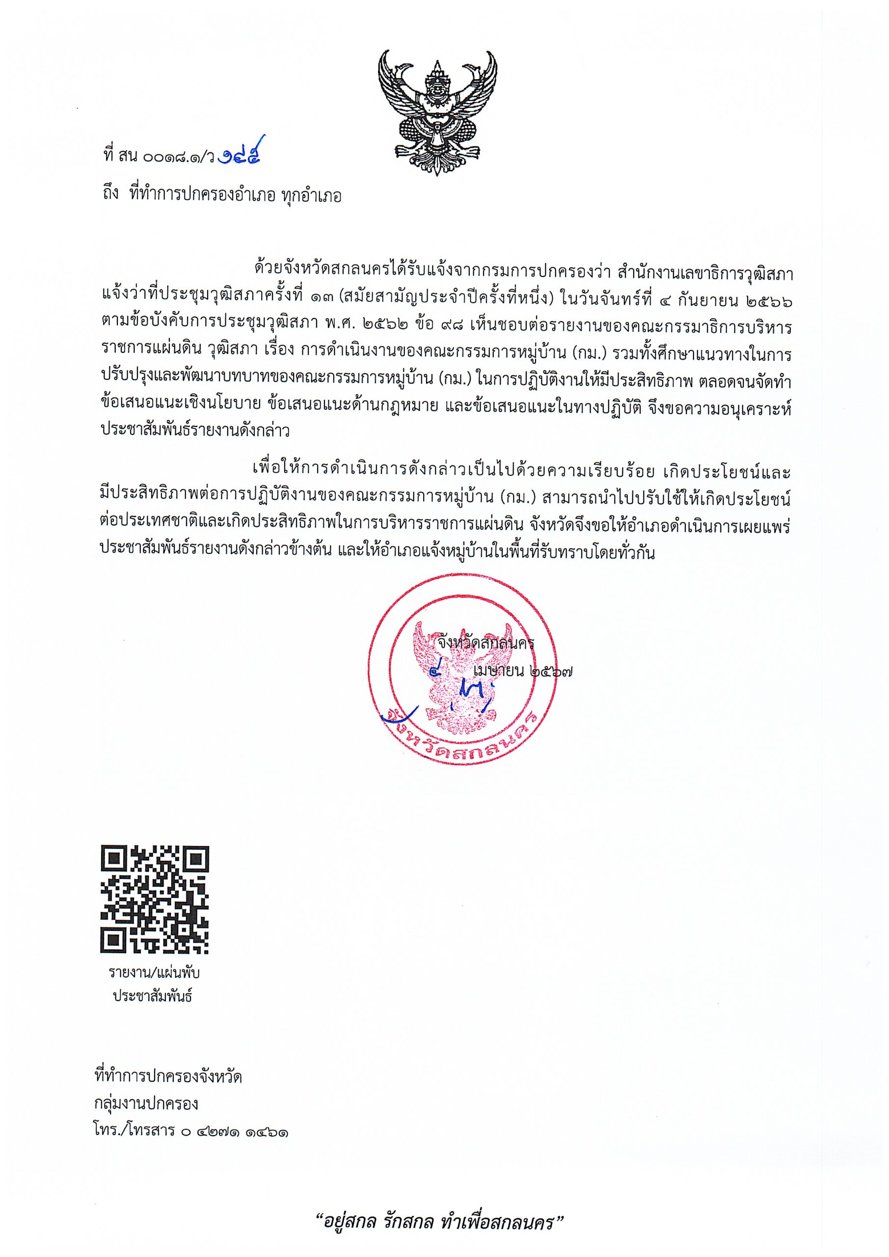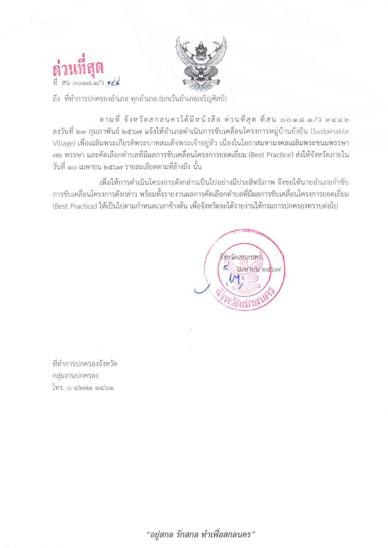 หนังสือจังหวัดสกลนคร ที่ สน 0018.1/ว 144 ลงวันที่ 4 เมษายน 2567 เรียน นายอำเภอ ทุกอำเภอ (ยกเว้นนอำเภอเจริญศิลป์) เรื่อง การขับเคลื่อนโครงการหมู่บ้านยั่งยืน (Sustisnable Village) เพื่อเฉลิมพระเกียรติพระบาทสมเด็จพระเจ้าอยู่หัว เนื่องในโอกาสมหามงคลเฉลิมพระชนมพรรษา 72 พรรษา DopaAdmin4 เมษายน 24กลุ่มงานปกครอง, ประกาศ/ระเบียบ/ดาวน์โหลด