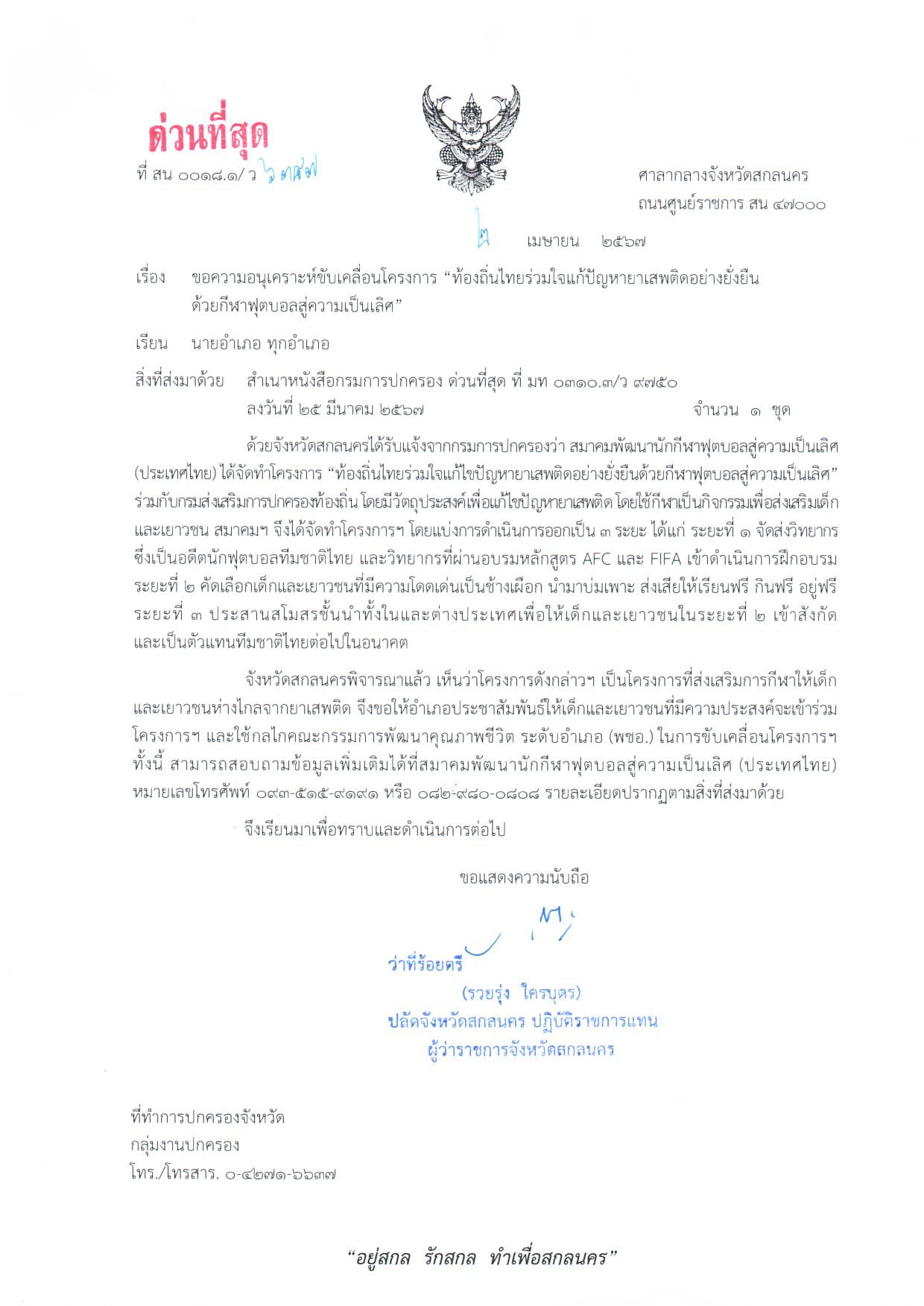 หนังสือจังหวัดสกลนคร ด่วนที่สุด ที่ สน 0018.1/ว6387 ลงวันที่ 2 เมษายน 2567 เรียน นายอำเภอ ทุกอำเภอ เรื่อง ขอความอนุเคราะห์ขับเคลื่อนโครงการ “ท้องถิ่นไทยร่วมใจแก้ปัญหายาเสพติดอย่างยั่งยืน ด้วยกีฬาฟุตบอลสู่ความเป็นเลิศ” DopaAdmin2 เมษายน 24กลุ่มงานปกครอง, ประกาศ/ระเบียบ/ดาวน์โหลด