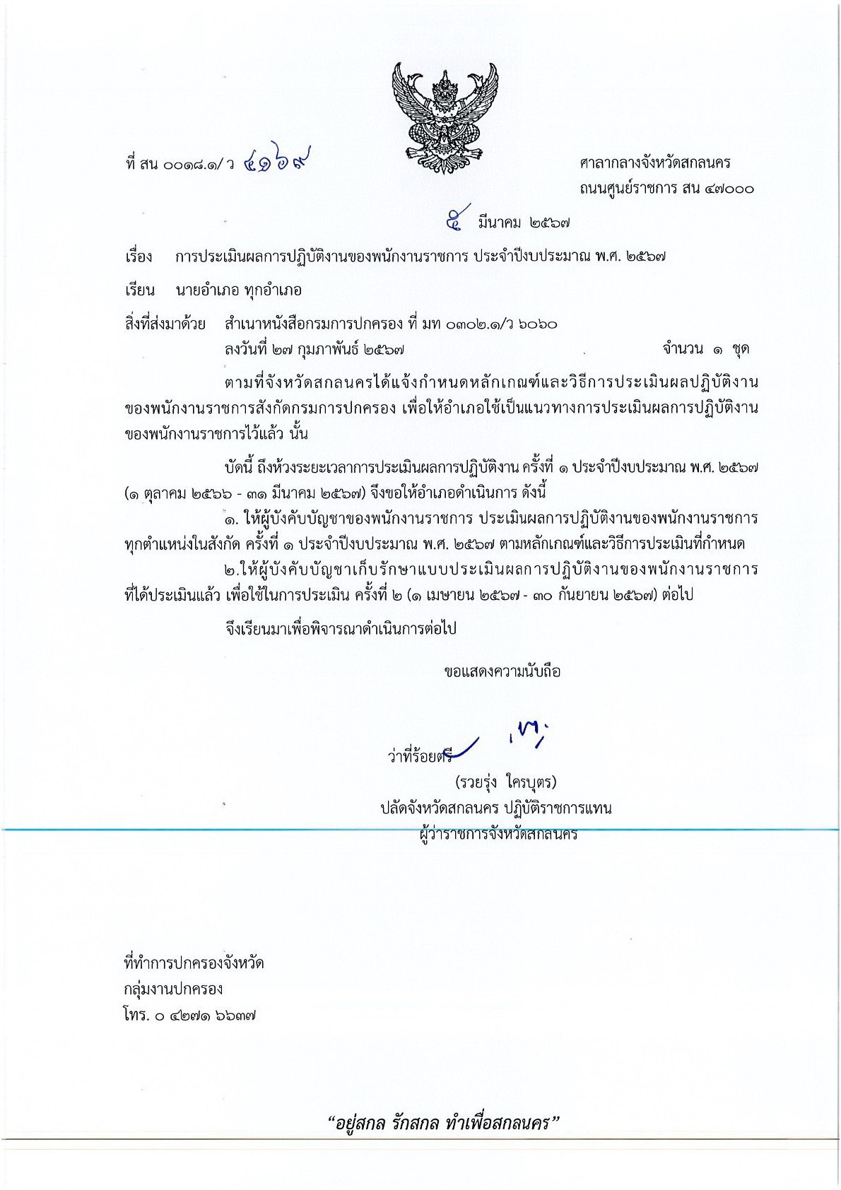 ที่ สน 0018.1/ว106 ลงวันที่ 12 มีนาคม 2567 เรียน นายอำเภอ ทุกอำเภอ เรื่อง การประเมินผลการปฏิบัติราชการของข้าราชการพลเรือนสามัญ ในสังกัดราชการบริหารส่วนภูมิภาค DopaAdmin12 มีนาคม 24กลุ่มงานปกครอง, ประกาศ/ระเบียบ/ดาวน์โหลด