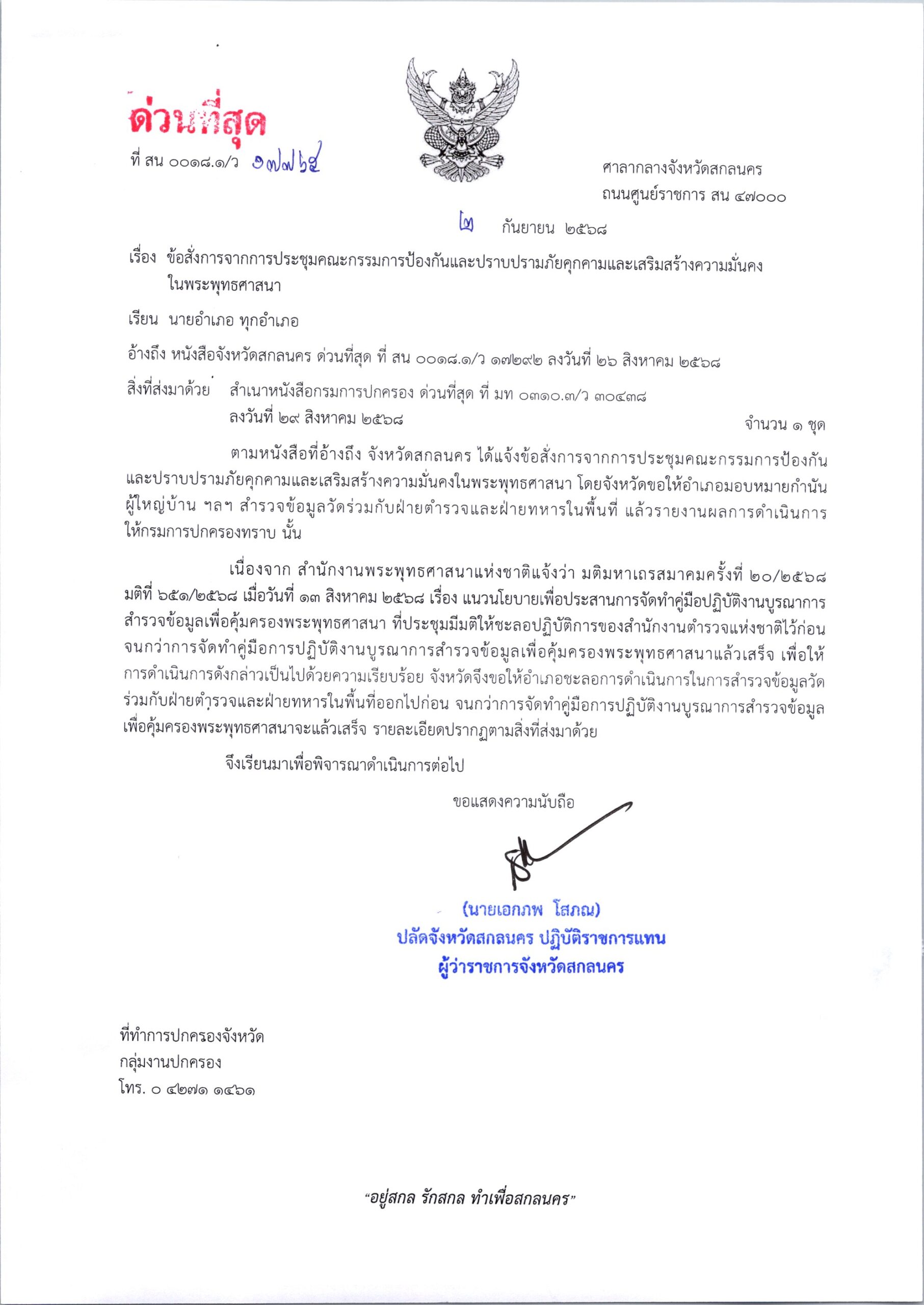 ด่วนที่สุด ที่ สน 0018.1/ว 17292 ลงวันที่ 26 สิงหาคม 2568 เรียน นายอำเภอ ทุกอำเภอ เรื่อง ข้อสั่งการจากการประชุมคณะกรรมการป้องกันและปราบปรามภัยคุกคามและเสริมสร้างความมั่นคงในพระพุทธศาสนา DopaAdmin26 สิงหาคม 25กลุ่มงานปกครอง, ประกาศ/ระเบียบ/ดาวน์โหลด