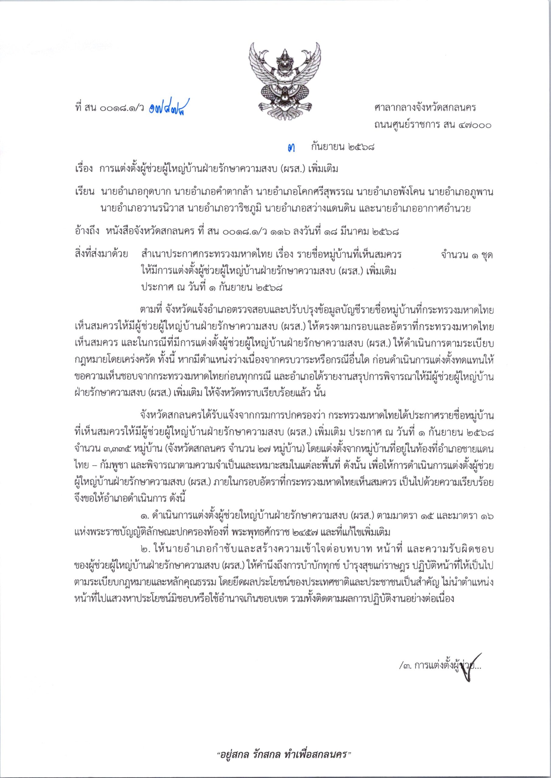 หนังสือจังหวัดสกลนคร ที่ สน 0018.1/441 ลงวันที่ 26 สิงหาคม 2568 เรื่อง การแต่งตั้งผู้ช่วยผู้ใหญ่บ้านฝ่ายรักษาความสงบ (ผรส.) เรียน นายอำเภอภูพาน DopaAdmin26 สิงหาคม 25กลุ่มงานปกครอง, ข่าวประชาสัมพันธ์, ประกาศ/ระเบียบ/ดาวน์โหลด