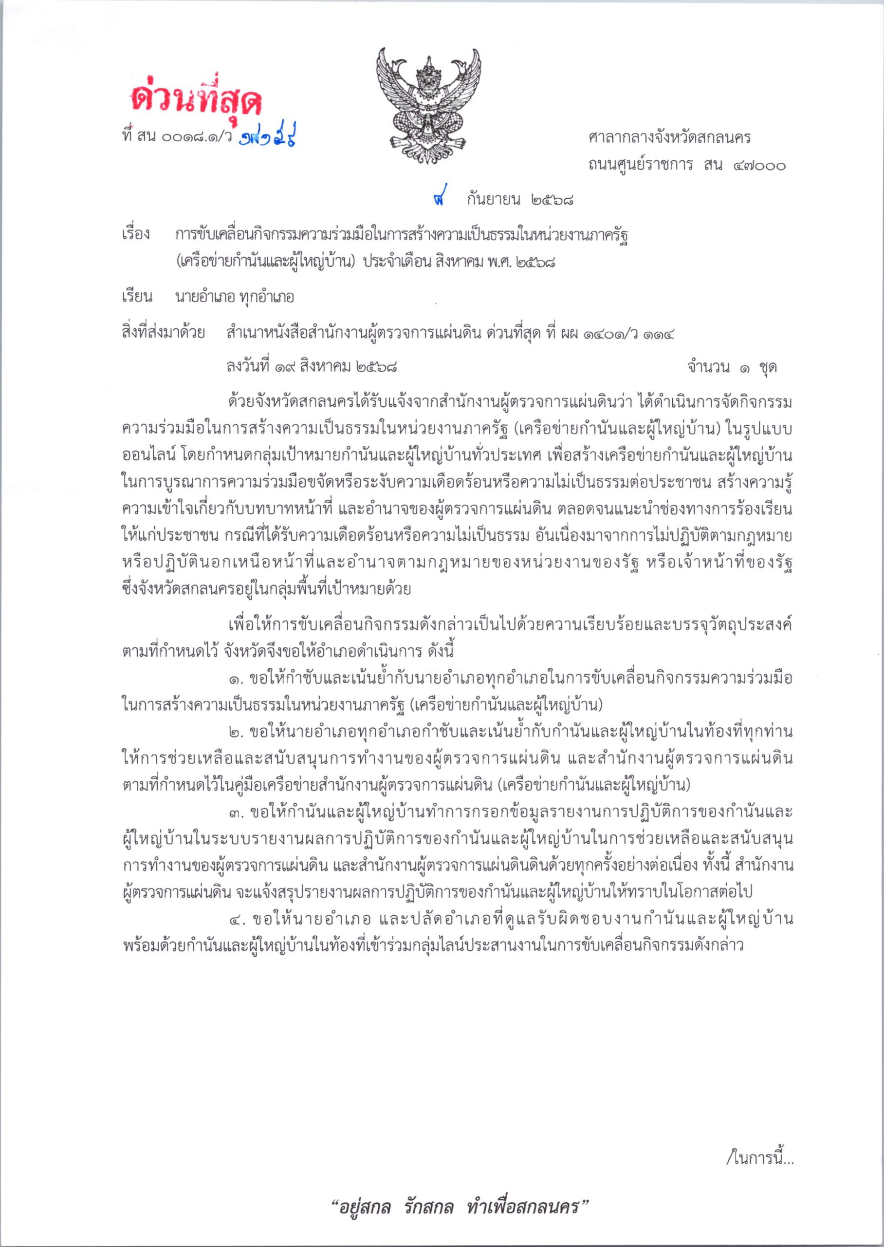หนังสือจังหวัดสกลนคร ที่ สน 0018.1/ว 17304 ลงวันที่ 27 สิงหาคม 2568 เรื่อง แต่งตั้งคณะทำงานขับเคลื่อนการดำเนินงานตามนโยบายสำคัญเร่งด่วนของกระทรวงมหาดไทย 8 Quick Win : 3 ไร้ทุกข์ 5 สร้างสุข เรียน นายอำเภอ ทุกอำเภอ DopaAdmin27 สิงหาคม 25กลุ่มงานปกครอง, ข่าวประชาสัมพันธ์, ประกาศ/ระเบียบ/ดาวน์โหลด