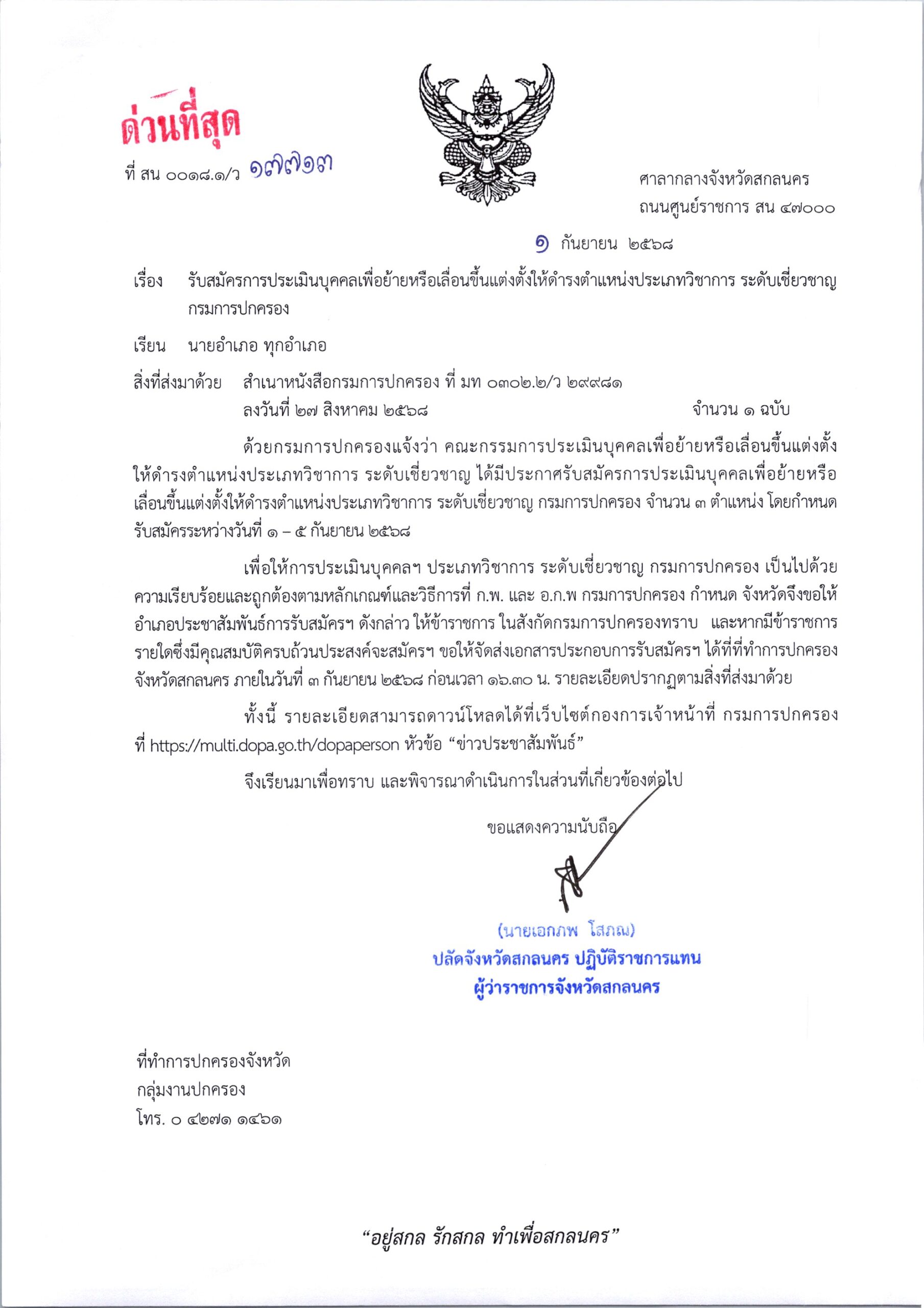 ที่ สน 0018.1/ว 17326 ลงวันที่ 27 สิงหาคม 2568 เรียน นายอำเภอเมืองสกลนคร นายอำเภอสว่างแดนดิน นายอำเภออากาศอำนวย นายอำเภอคำตากล้า นายอำเภอพรรณานิคม นายอำเภอวาริชภูมิ นายอำเภอนิคมน้ำอูน นายอำเภอส่องดาว นายอำเภอโพนนาแก้ว นายอำเภอภูพาน นายอำเภอโคกศรีสุพรรณ นายอำเภอเต่างอย และนายอำเภอกุดบาก เรื่อง การย้ายข้าราชการ และให้ข้าราชการช่วยราชการ DopaAdmin5 กันยายน 25กลุ่มงานปกครอง, ประกาศ/ระเบียบ/ดาวน์โหลด