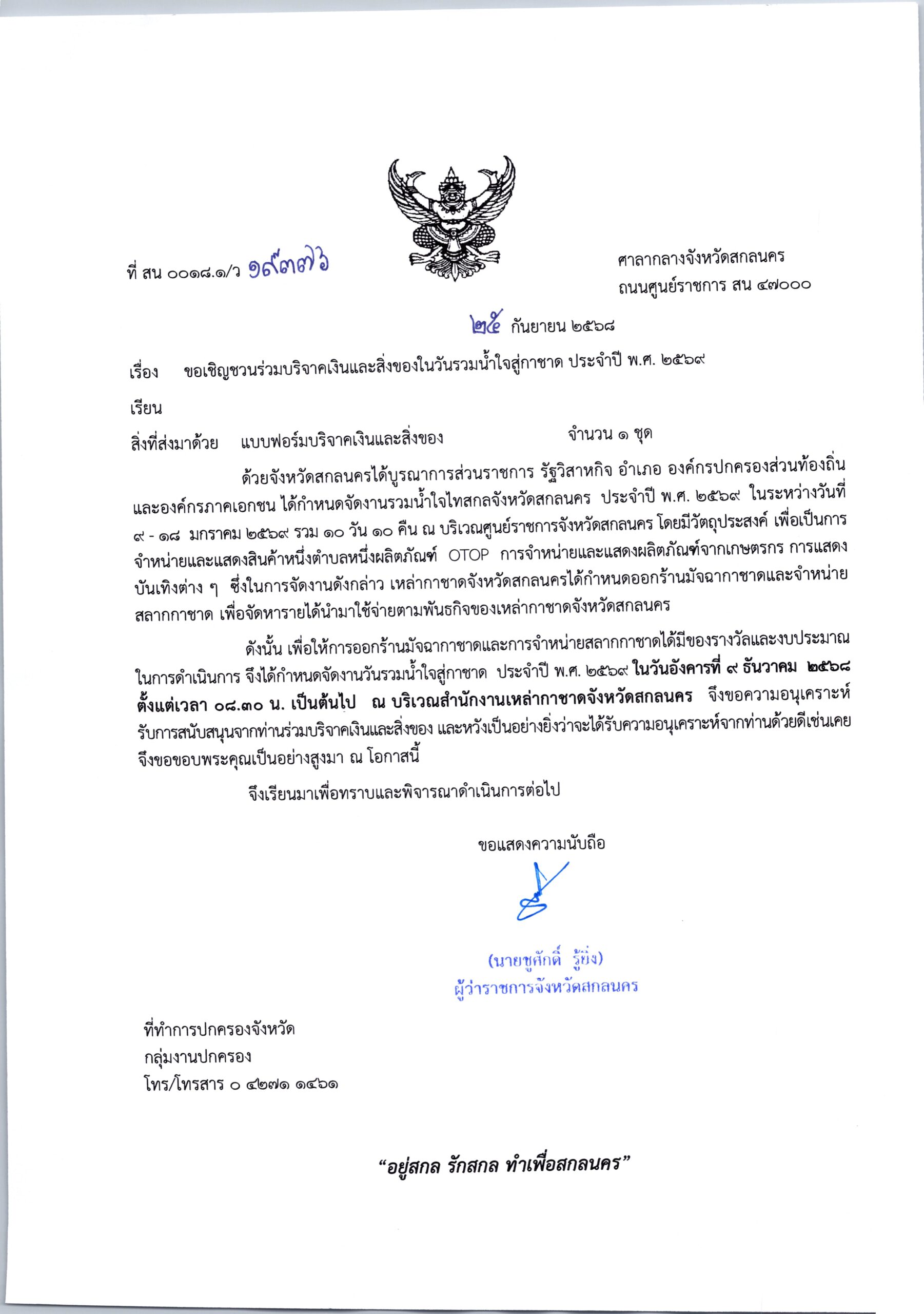 ที่ สน 0018.1/ว19376 ลงวันที่ 25 กันยายน 2568 เรียน นายอำเภอ ทุกอำเภอ เรื่อง ขอเชิญชวนร่วมบริจาคเงินและสิ่งของในวันรวมน้ำใจสู่กาชาด ประจำปี พ.ศ. 2569