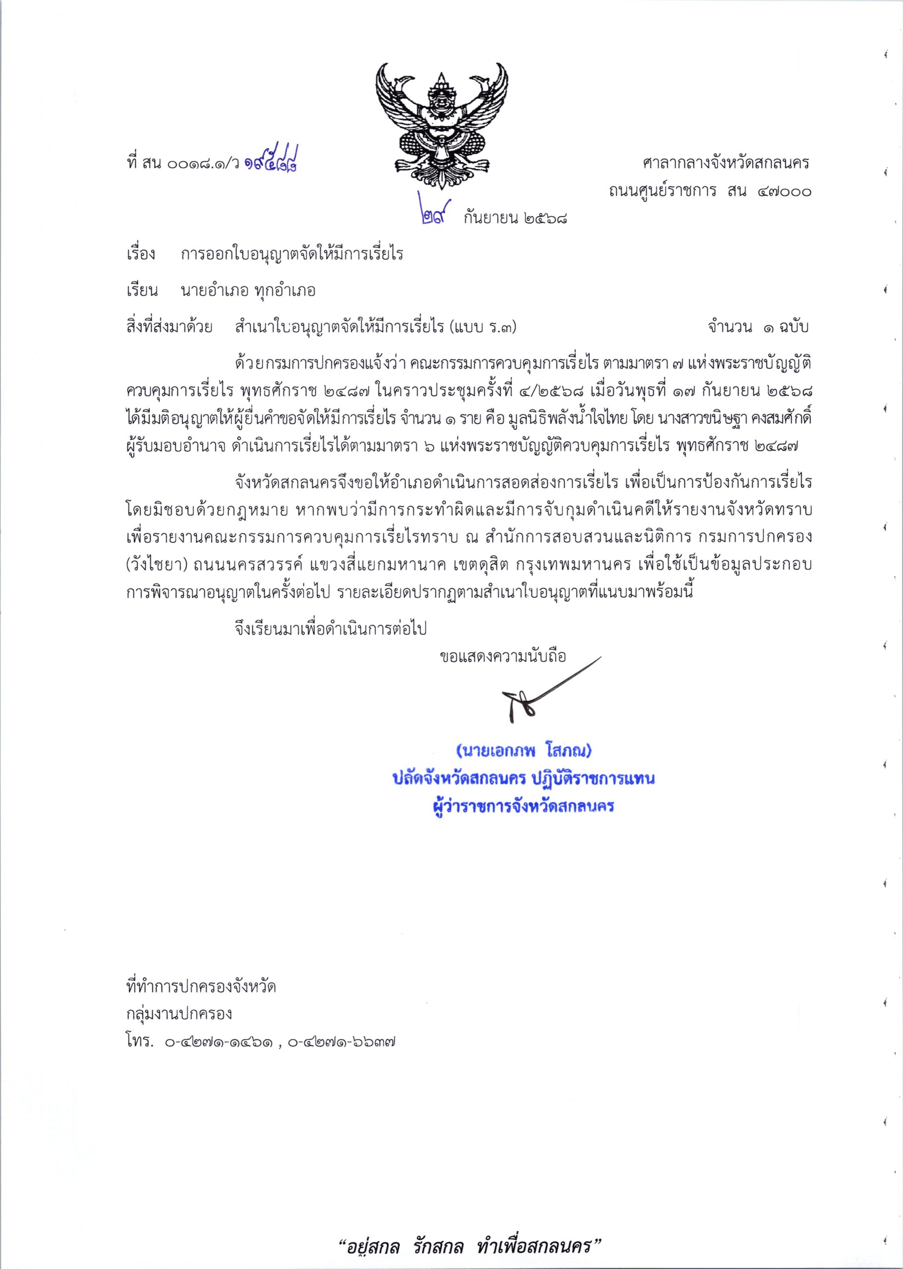 ที่ สน 0018.1/ว19588 ลงวันที่ 29 กันยายน 2568 เรียน นายอำเภอ ทุกอำเภอ เรื่อง การออกใบอนุญาตจัดให้มีการเรี่ยไร