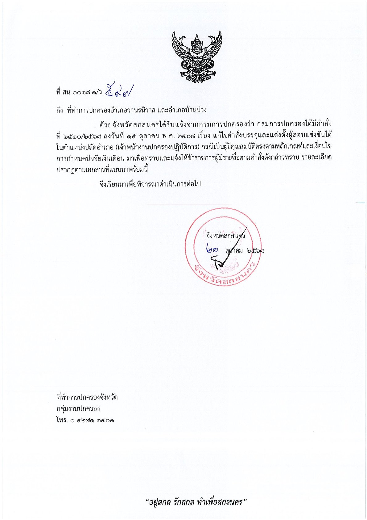 ที่ สน 0018.1/ว 597 ลงวันที่ 20 ตุลาคม 2568 เรียน ที่ทำการปคกรองอำเภอวานรนิวาส และอำเภอบ้านม่วง เรื่อง แก้ไขคำสั่งบรรจุและแต่งตั้งผู้สอบแข่งขันได้